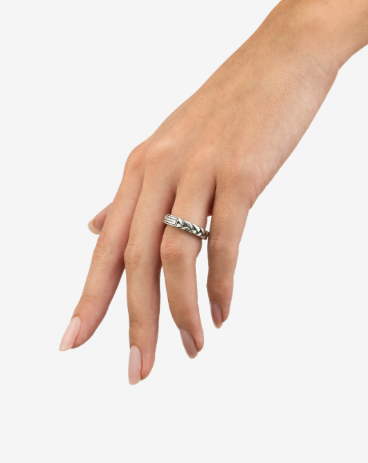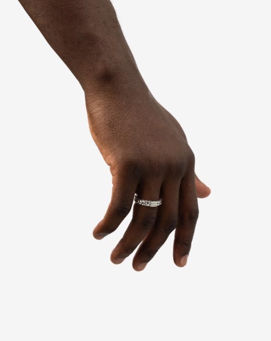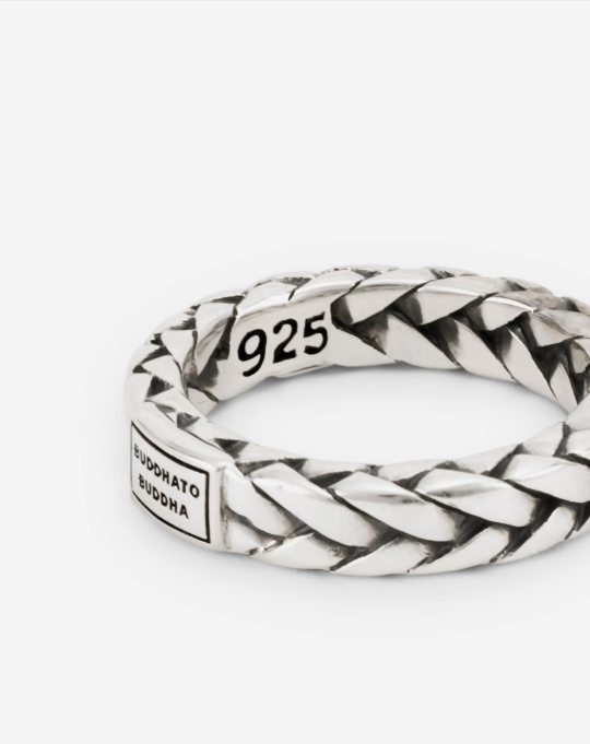 De George Small Ring is een eerbetoon aan verfijnd vakmanschap en gedetailleerd design. Deze ring, met zijn kenmerkende schakelontwerp, is gebaseerd op een traditionele Balinese weeftechniek. Elk detail van de ring is zorgvuldig vormgegeven, waarbij de kunst van het handwerk en traditioneel ontwerp tot uiting komt. Gemaakt van uit gerecycled zilver, is de George Small Ring niet zomaar een sieraad, maar ook een statement van duurzaamheid, vakmanschap en kwaliteit. Ontworpen in Amsterdam en met liefde handgemaakt in Zuidoost-Azië. Draag het als een viering van jouw unieke stijl en de bijzondere momenten in het leven. Met wie of wat verbind jij jezelf door dit sieraad te dragen?