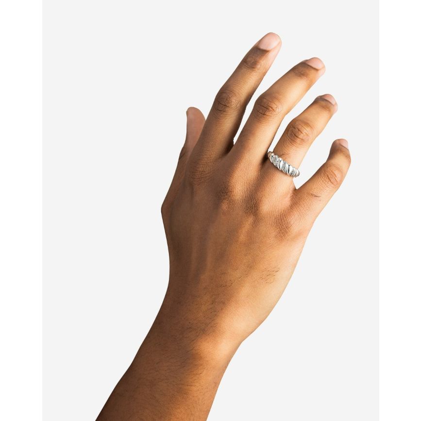 Geïnspireerd door de schoonheid van de natuur, symboliseert de Ring Ellen Spiraal Gradient creativiteit en energie met zijn unieke, draaiende ontwerp. Dit eigentijdse sieraad combineert textuurelementen van het iconische Ellen-weefpatroon met gepolijste details, wat een dynamisch contrast oplevert dat zowel schoonheid als kracht weerspiegelt. Het spiraalontwerp, bekend om zijn talismanische eigenschappen, staat voor groei en beweging, wat deze ring meer maakt dan alleen een statement—het is een betekenisvolle aanvulling op jouw sieradencollectie. Gemaakt van duurzaam gerecycled 925 sterling zilver en handgemaakt in Zuidoost-Azië, belichaamt de ring een mix van modern vakmanschap en tijdloze symboliek. Combineer het met de bijpassende hanger en oorbellen uit de Ellen Spiraal collectie en vier de kracht van creativiteit en verbinding.