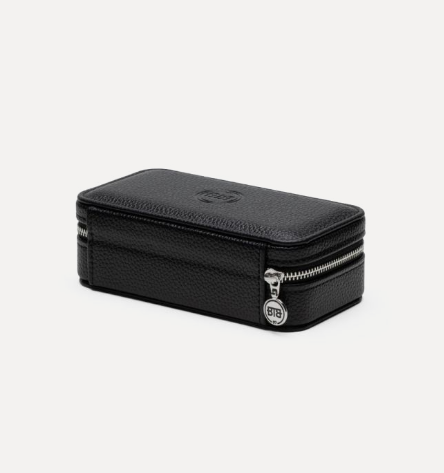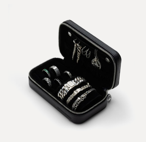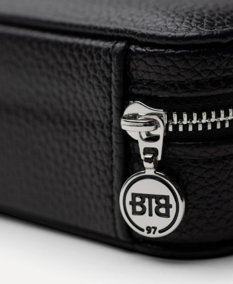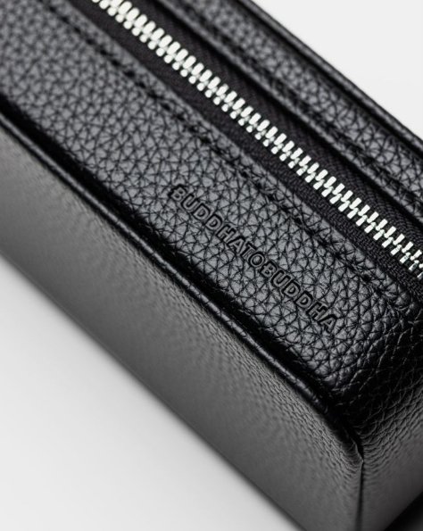De Jewelry Travel Case Black Medium biedt een luxueuze en praktische manier om je sieraden overzichtelijk te bewaren, zowel thuis als onderweg. In de flap bevindt zich een afneembare strip met drukknopen voor het opbergen van 5 paar oorbellen, terwijl kettingen eromheen gehangen kunnen worden. Onderin biedt de case aan de linkerkant ruimte voor meerdere ringen, oorbellen en hangers, terwijl de rechterkant een uitneembare armband-rol bevat, ideaal voor meerdere armbanden. Voor grotere armbanden kan de armband-rol worden verwijderd om extra ruimte te creëren. De case is gemaakt van RCS-gecertificeerd gerecycled PU en de voering van GRS-gecertificeerd gerecycled polyester. De duurzame sieradenetui is afgewerkt met een zilverkleurige BTB-ritssluiting en BUDDHATOBUDDHA logo’s die in reliëf zijn aangebracht.
