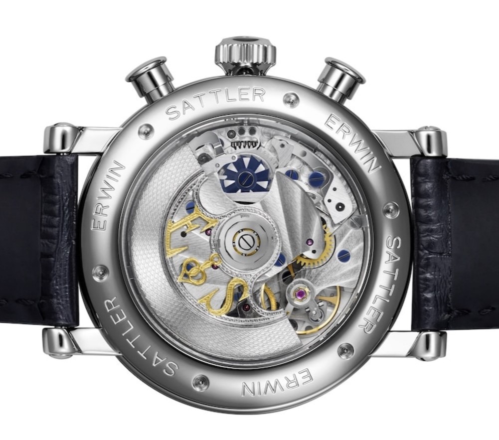 Genummerde zilveren wijzerplaat. Geblauwd stalen wijzers. Hand gegraveerde en geskeletteerde rotor voorzien van het Erwin Sattler loge. Naar wens ook te voorzien van uw initialen.