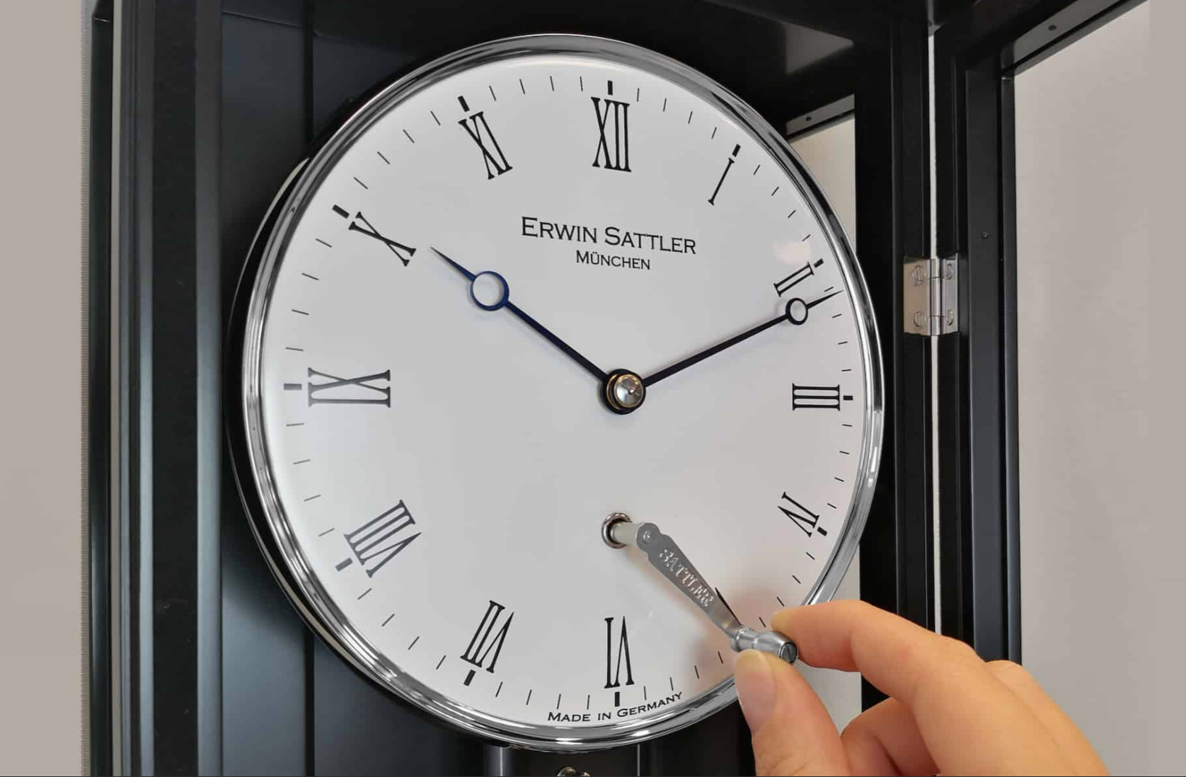 Zwart gelakt kast met metaal inleg. 70 cm hoog 20,5 cm breed en 10 cm diep. Uurwerk Sattler Caliber 1415. Loopduur 30 dagen. 4 Precisie kogellagers en 9 Robijn lagers. Emaillen wijzerplaat. Blauw stalen wijzers. Passage slagwerk op rondgong. Ontspiegeld mineraal glas.