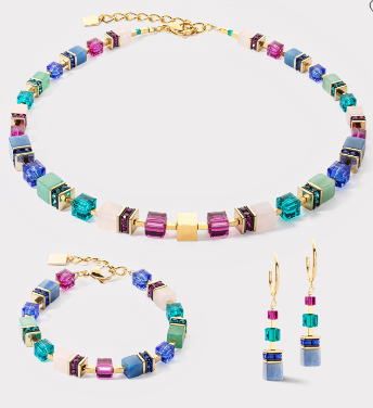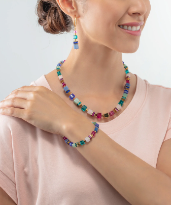 Deze gouden en veelkleurige GEOCUBE® Precious Statement armband is een stijlvolle aanvulling op de ketting of oorbellen.