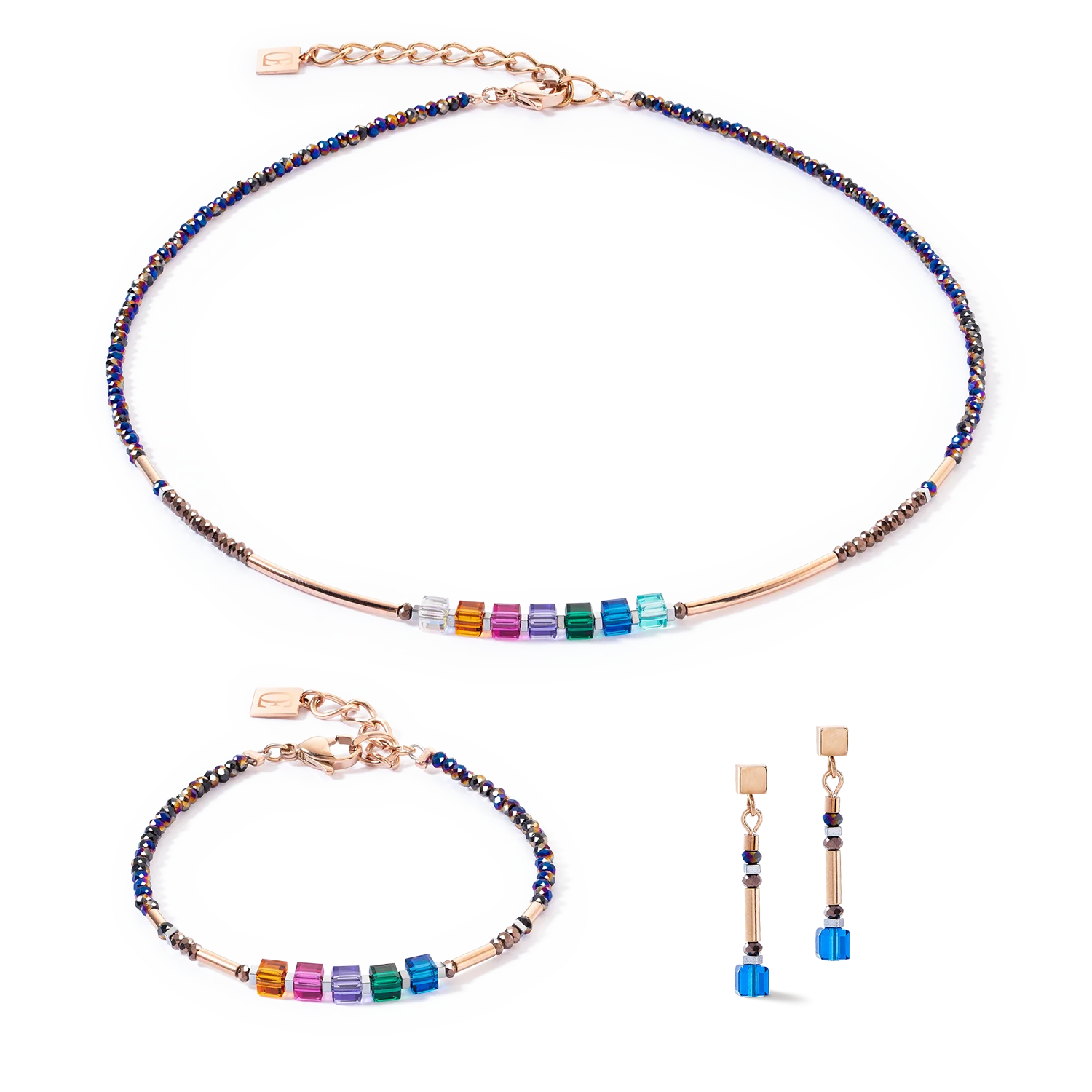 Cube Story Minimalistische Sprankelende Armband Multicolour Herfst - Tijdloze elegantie met een vleugje kleur De Cube Story Minimalistic Sparkling Bracelet in de Multicolour Autumn versie is het perfecte accessoire voor iedereen die ingetogen elegantie en levendige kleuren wil combineren in één sieraad. Deze filigrane armband combineert delicate, glinsterende kristallen kralen met heldere kubussen in levendige herfstkleuren zoals oranje, roze, groen en blauw. De roségoud vergulde elementen geven het ontwerp een warme, luxueuze touch. Door het minimalistische ontwerp kan de armband op verschillende manieren worden gecombineerd - of het nu gaat om een kleurrijk detail in het dagelijks leven of om een stijlvol hoogtepunt voor speciale gelegenheden. De fijne, donkere kralen laten de kleurrijke kubussen perfect uitkomen en zorgen voor een harmonieus totaalbeeld dat je pols een subtiel maar effectief accent geeft. De Cube Story Minimalistische Sprankelende Armband Multicolour Autumn is ideaal voor iedereen die van moderne, elegante sieraden houdt en een vleugje kleur aan zijn stijl wil toevoegen. Combineer het met de bijpassende oorbellen of ketting uit dezelfde lijn voor een harmonieuze look die gegarandeerd de aandacht trekt.