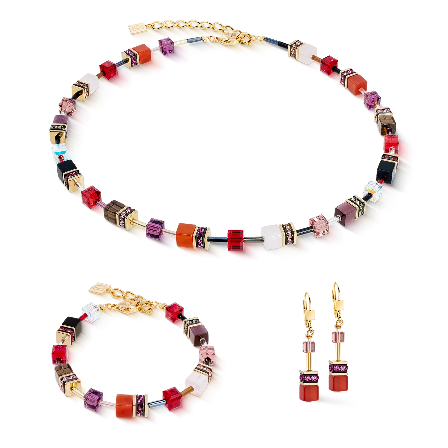 Felle kleuren, sterke stenen – deze ketting is een feest voor de zintuigen: carneol in felrood, onyx in diep zwart, delicaat rozenkwarts en warme rokerige kwarts combineren in de iconische GeoCUBE-kubussen® tot een compositie vol energie. Swarovski-kristallen® en fonkelende kristallen zorgen voor fonkelende accenten, terwijl goudkleurig roestvrij staal een elegante glans geeft. Zorgvuldig met de hand vervaardigd in Duitsland, combineert dit sieraad moderne elegantie met de natuurlijke uitstraling van echte edelstenen – perfect om elke outfit te transformeren tot een expressieve look.
