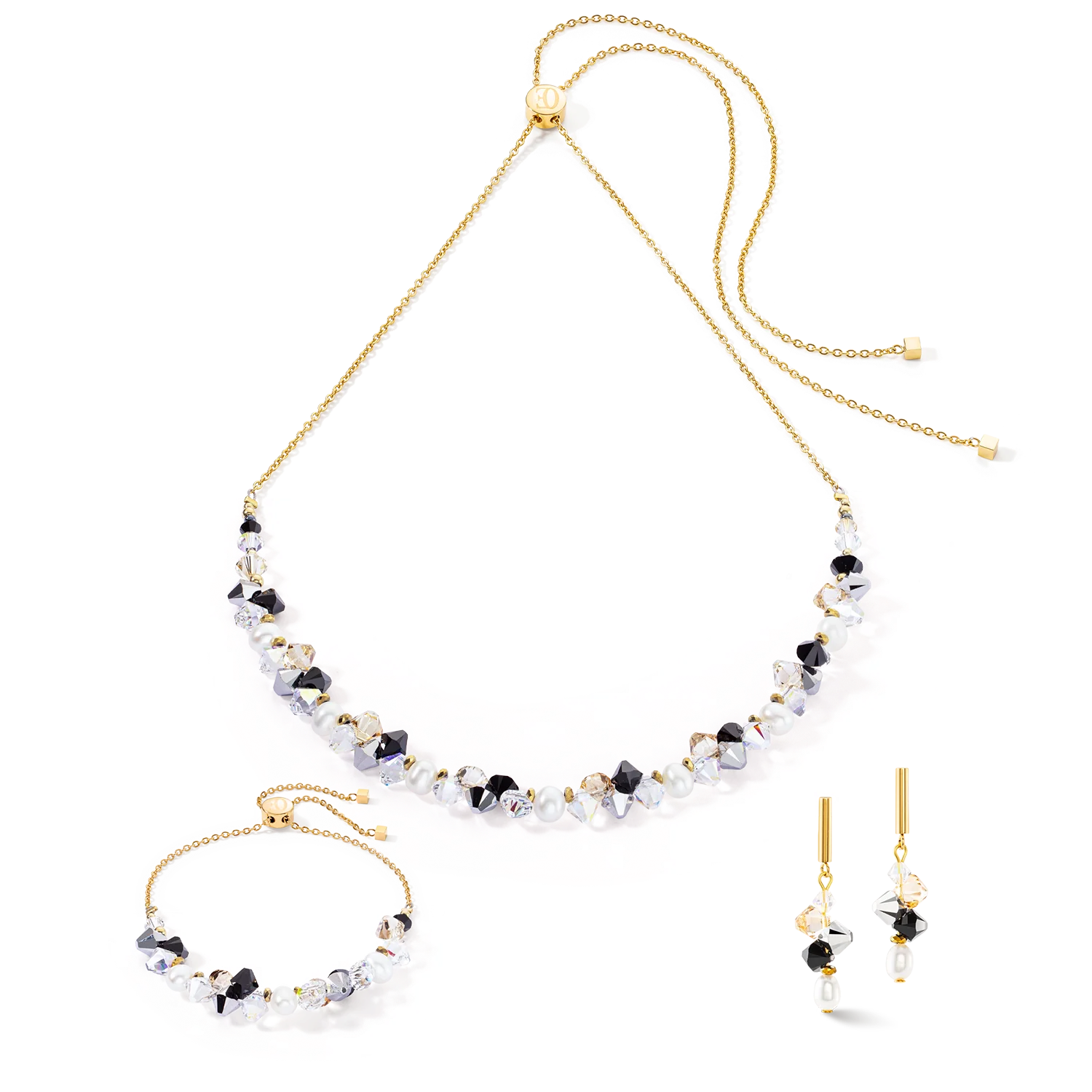 Dompel jezelf onder in de magische wereld van onze Pearl-versie van de populaire Dancing Crystals - een fascinerende combinatie van delicaat glinsterende zoetwaterparels en sprankelende kristallen in zwart, zilver, kristal en beige. Perfect voor speciale gelegenheden of om een vleugje glamour toe te voegen aan je dagelijkse look.