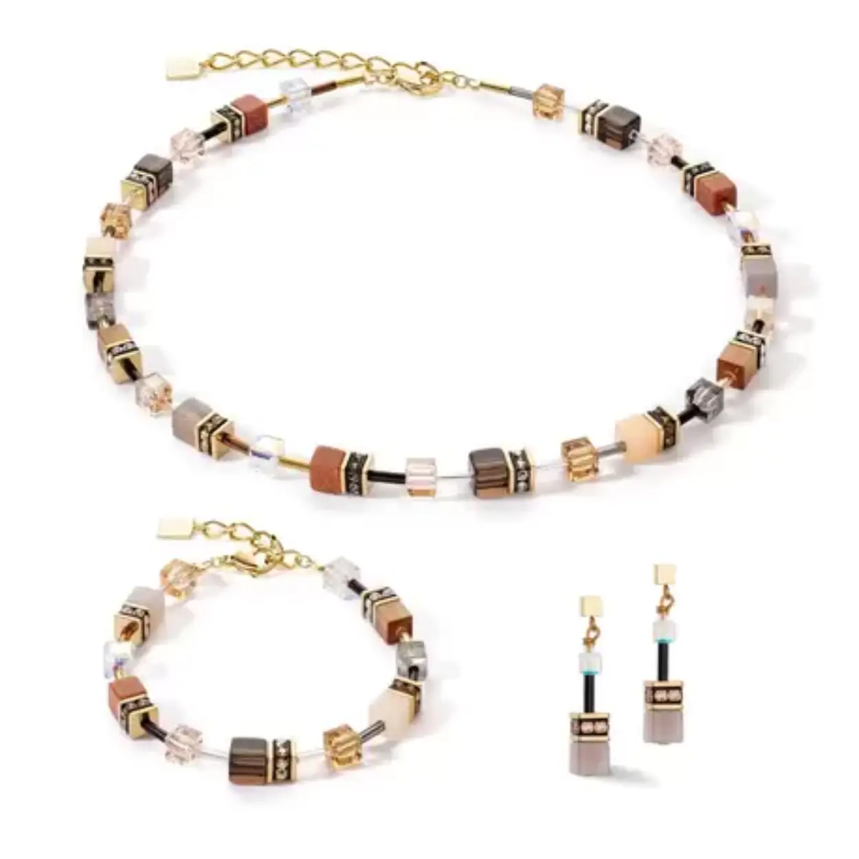 Chique bruin GeoCUBE®-model met natuurstenen uit de collectie van Coeur de Lion, nieuw in geschenkverpakking. Het vergulde collier is gemaakt van staal, geregen met natuursteen zoals rookquartz en aventurijn en geeft de drager een gevoel van harmonie. Gebruikte materialen zijn: bruin rookquartz, gebarsten bergkristal, roze aventurijn, synthetische tijgeroog, grijs agaat en goud zandsteen, gecombineerd met kristallen en strass rondellen geregen aan roestvrijstaal geelverguld.