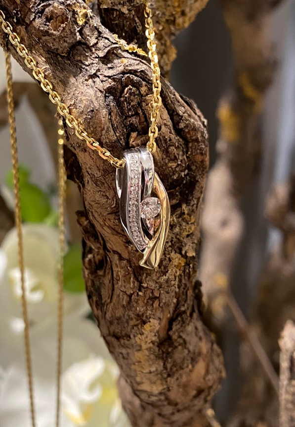 14 Karaat geel met witgouden hanger van Mori Exclusive Diamonds met daarin 0.37 crt briljant G/VVS!.