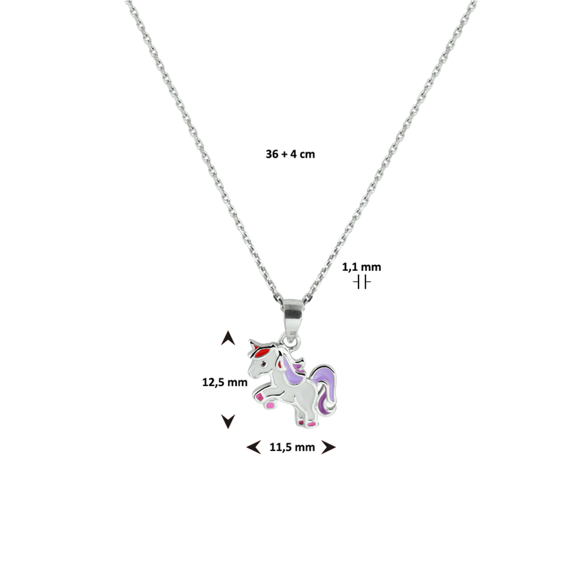 Schattig gerhodineerd zilveren kindercollier met een eenhoorn hanger van 12.5x11.5mm. De lengte bedraagt 36cm met een 4cm extensie en de schakelbreedte is 1.1mm. Info: Gerhodineerd zilver is door de rhodiumlaag beter bestand tegen verkleuren en krassen.