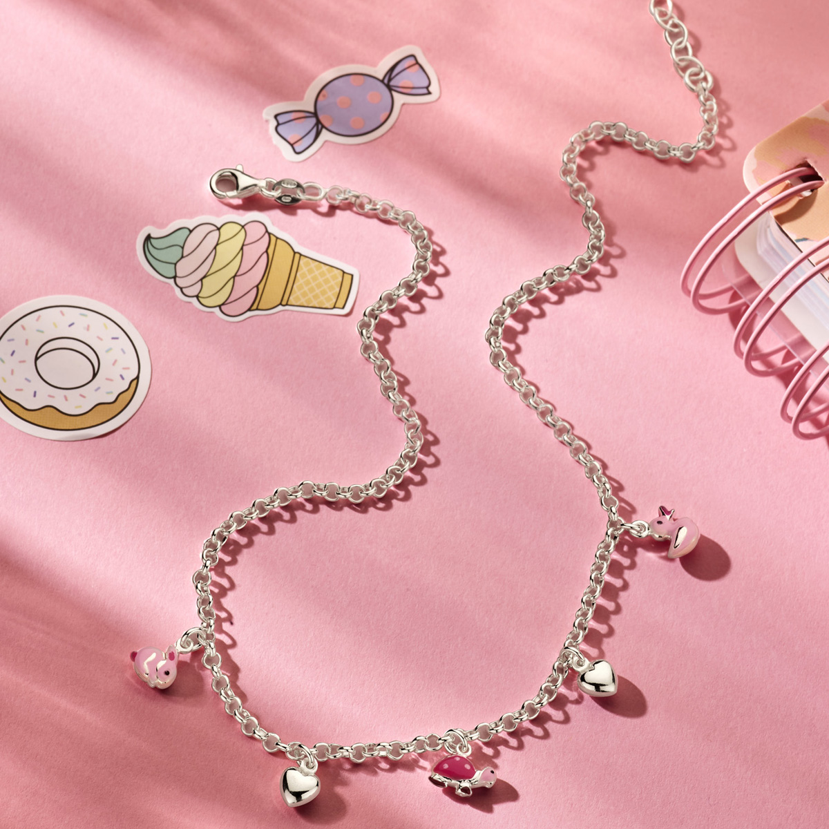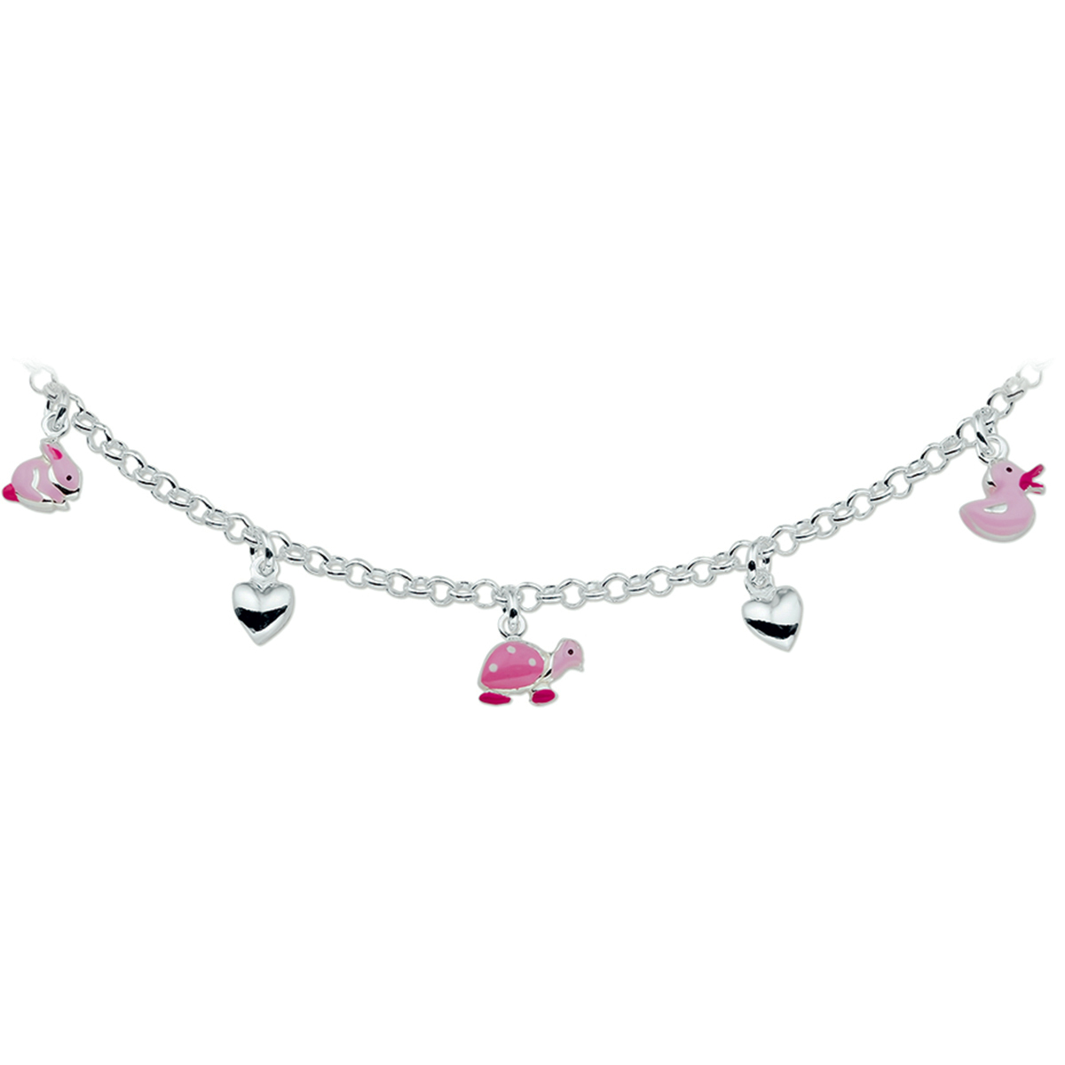 Zilveren collier met hartjes en diverse dierenbedels van roze emaille. De lengte van het collier bedraagt 36cm met 2cm extensie. De schakelbreedte bedraagt 3.0mm.