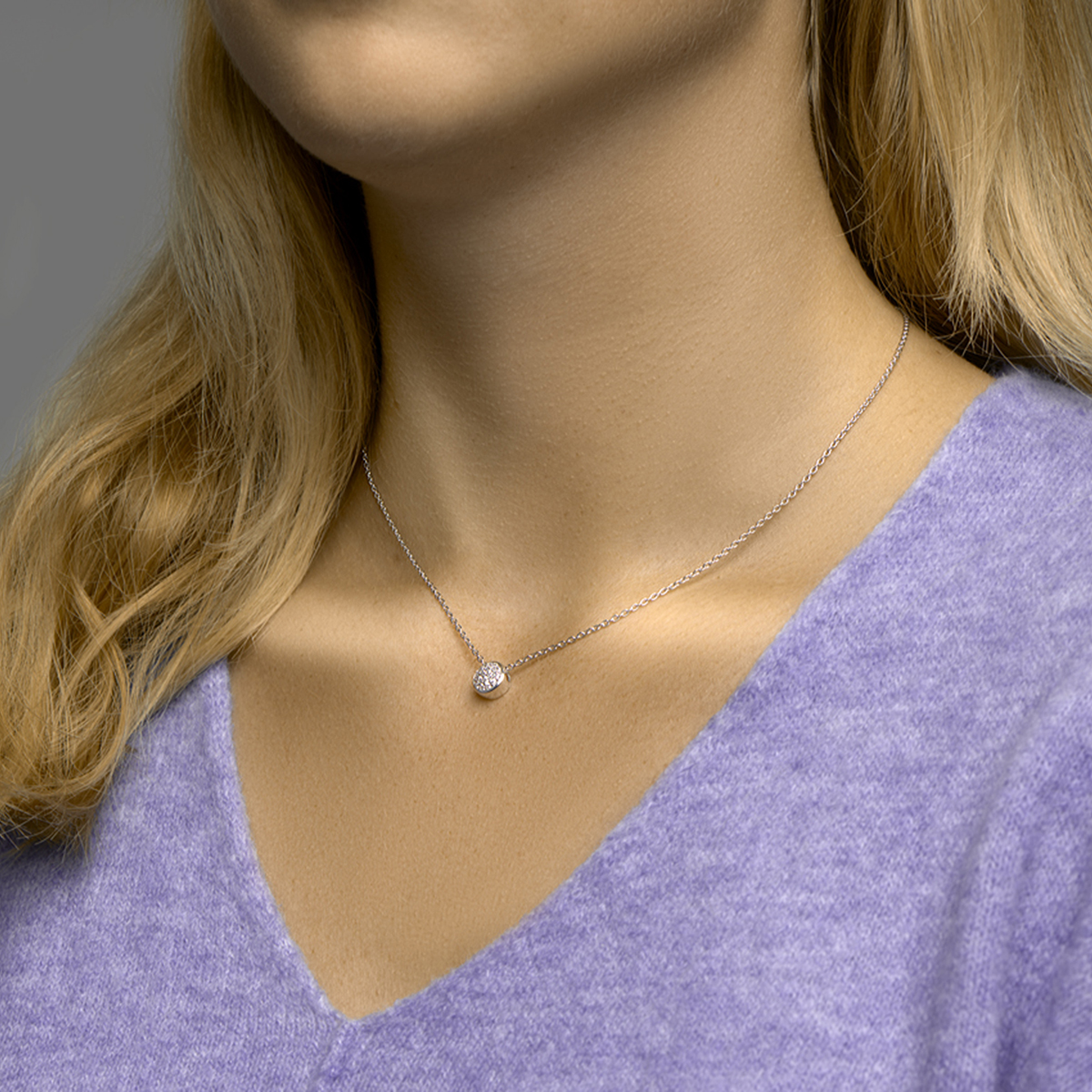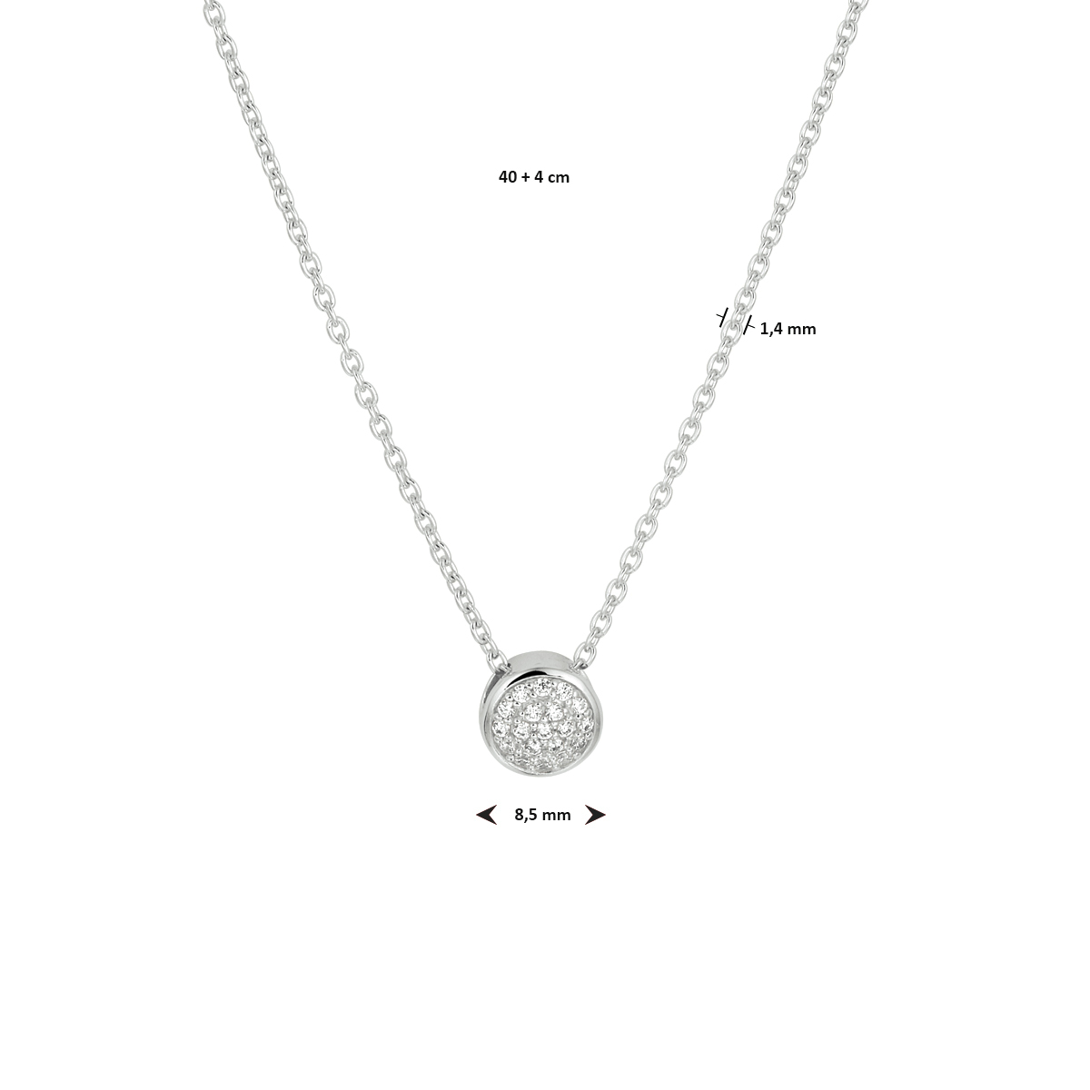 Gerhodineerd 925 zilveren collier uitgevoerd met een rond hangertje met daarin een schitterend zirkonia vlak. Het collier heeft een draaglengte van 40cm met een extensie van 4cm en een stevige karabijn sluiting. Het rondje heeft een diameter van 8.5mm.