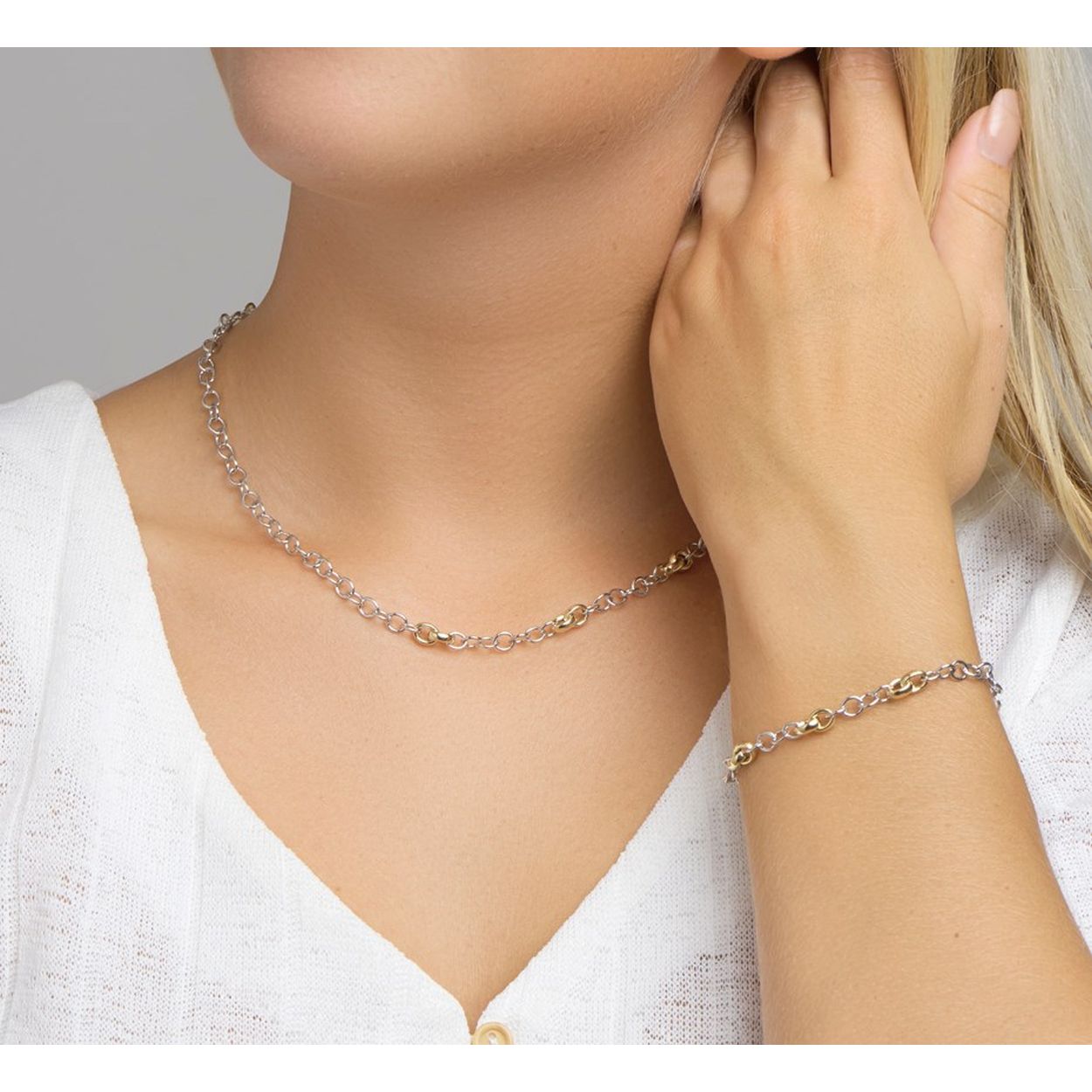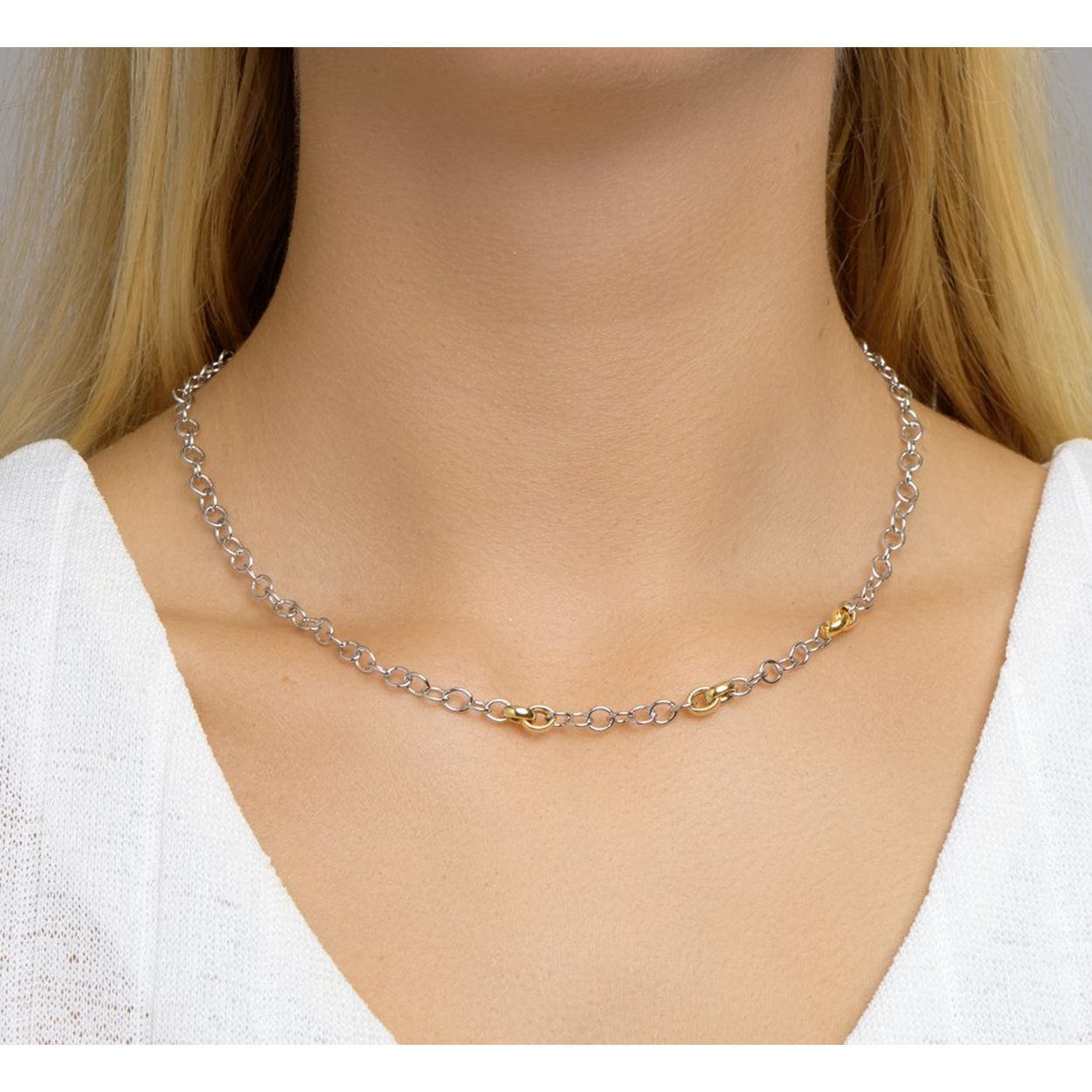 925 zilveren draadschakel collier met 14 karaat geel gouden tussen schakels. Uitgevoerd met een karabijn sluiting. Het collier heeft een draaglengte van 45cm. De schakelbreedte is 5.5mm.