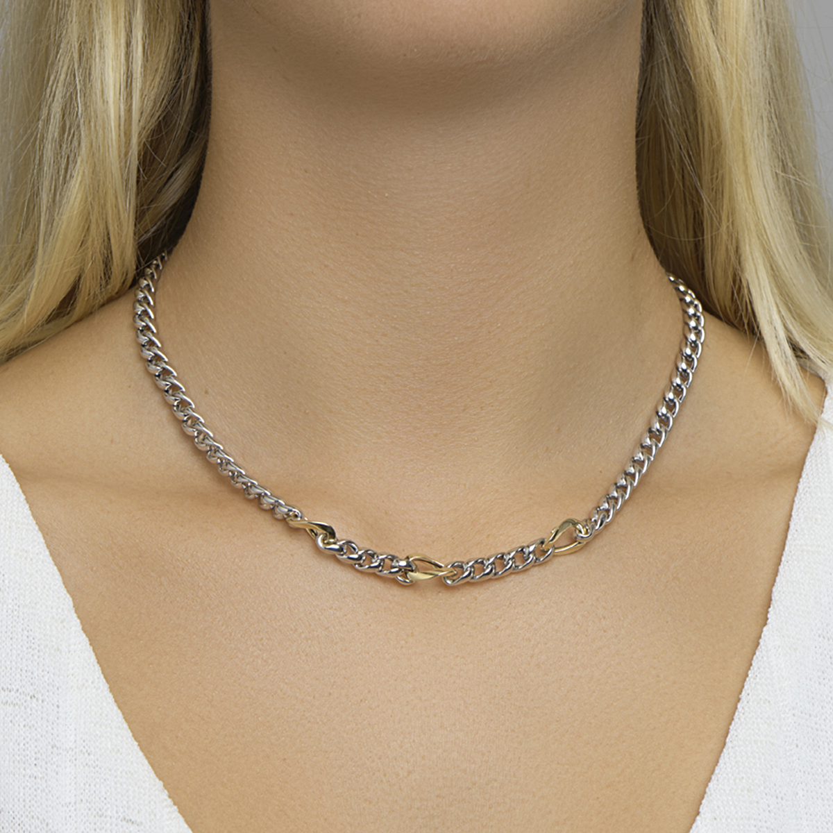 925 zilveren Gourmet collier met 14 karaat geel gouden tussen schakels. Uitgevoerd met een karabijn sluiting. Het collier heeft een draaglengte van 45cm. De schakelbreedte is 8.5mm.