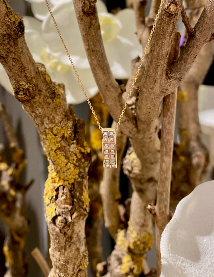 Fijn 14 karaat geel gouden anker collier 42 cm lang met daaraan en strakke  geel gouden hanger met 2 rijen pavé gezette fijne briljantjes. Totaal 0.09 crt H/SI-1.
