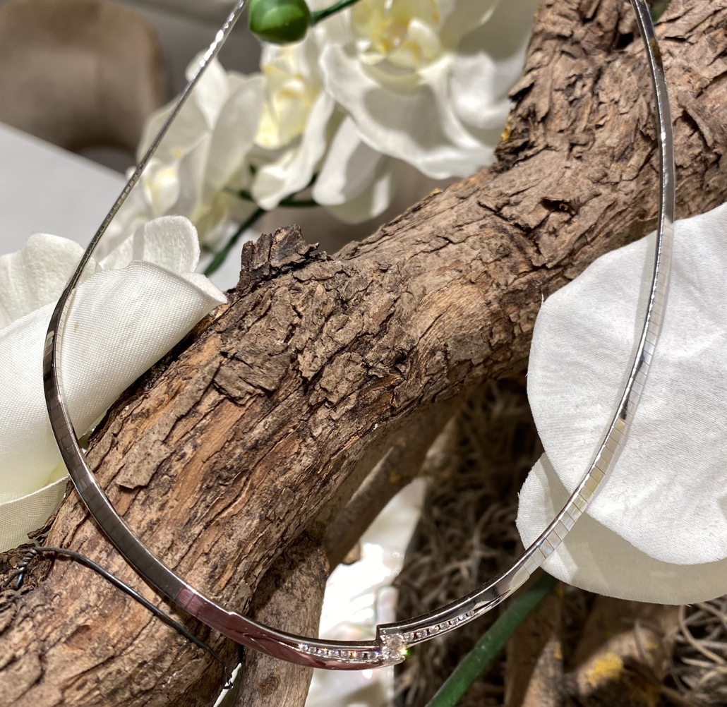 Exclusief 14 karaat witgouden vlak Omega collier met daarin totaal 0.30 crt G/VSI briljant. Midden steen 0.18 crt.