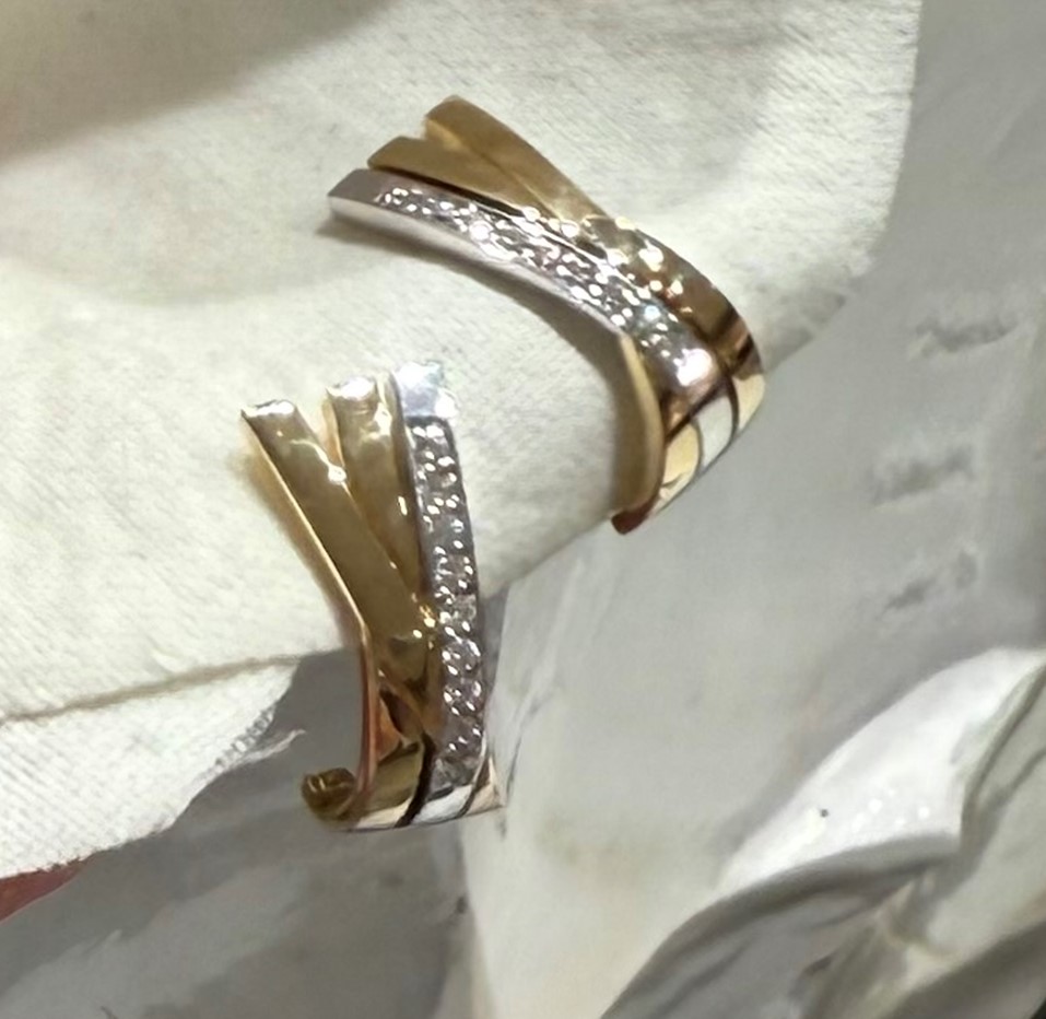 14 Karaat geel met witgouden oorstekers met daarin pavé gezet 0.09 crt briljant H/SI-1.