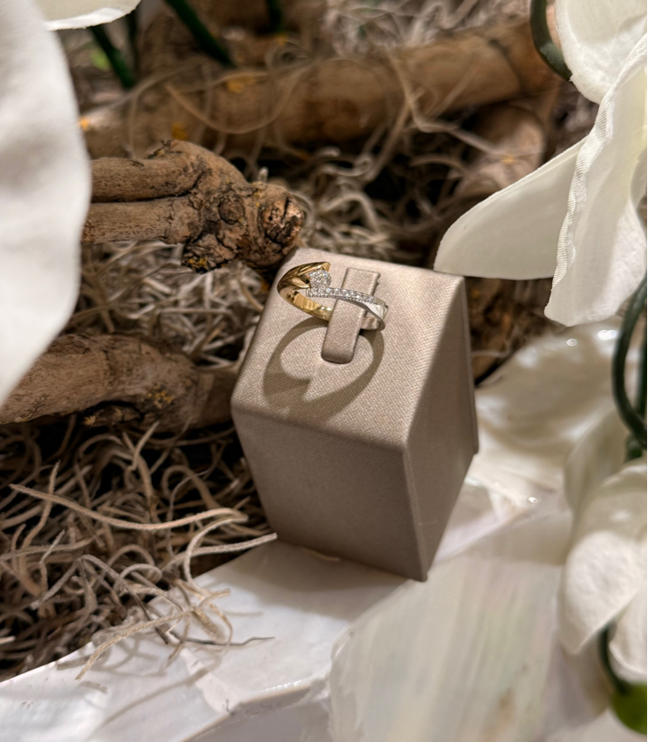 14 Karaat geel- met witgouden slagring met daarin totaal 0.25 crt briljant G/VVS1.
