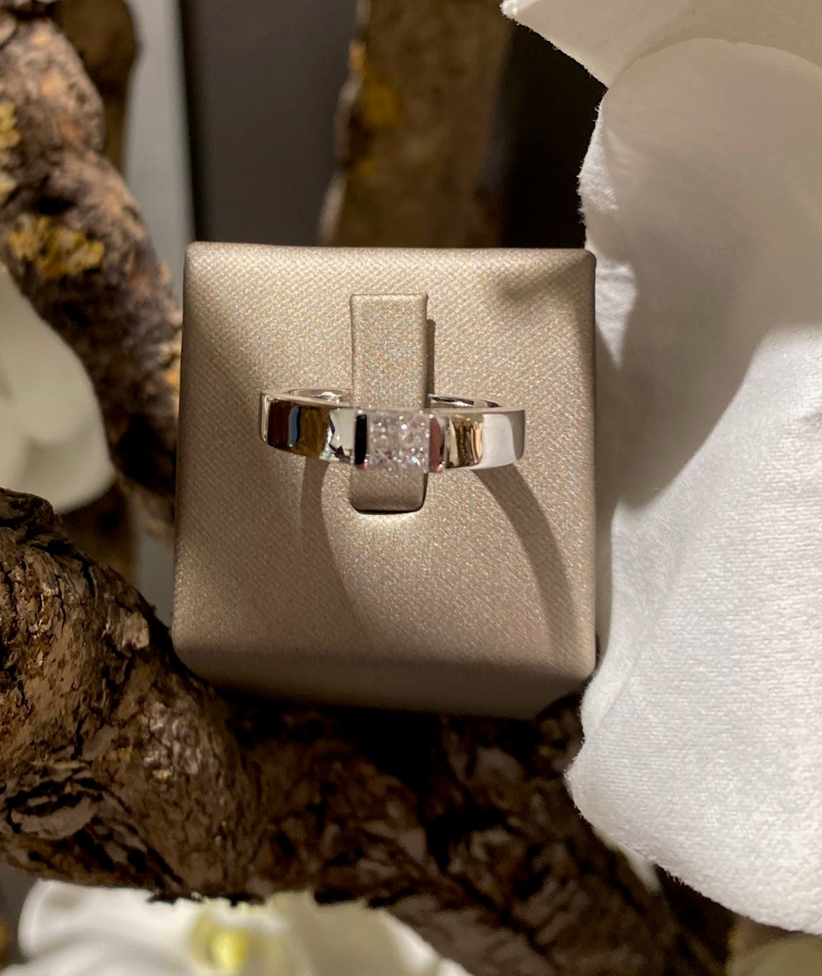 14 Karaat witgouden dames fantasie ring pavé bezet met 4 Princesse geslepen diamanten totaal  0.22 crt H/VS1.
