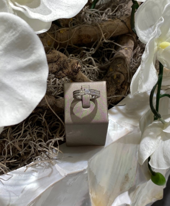 14 karaat witgouden solitair ring met zijstenen in een dubbele baan rail gezet. Totaal 0.50 crt H/SI-1.