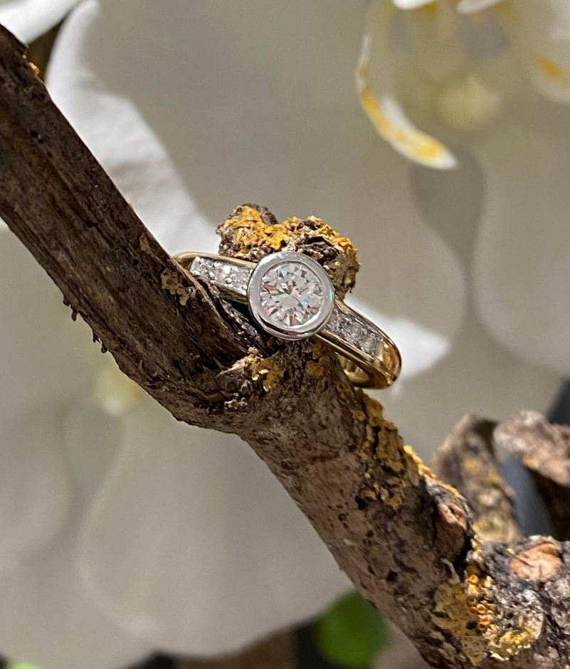 14 Karaat geel met witgouden solitair ring met zijstenen. Midden steen in Donut zetting. Totaal 0.65 crt briljant G/VVS1.