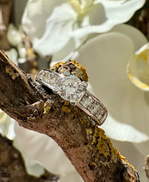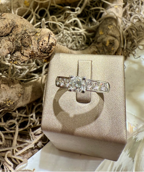 14 Karaat witgouden solitair ring met zijstenen. Midden steen briljant 0.62 crt G/VVS1. Zijstenen briljant 6 stuks totaal 0.48 crt G/VS1. Tptaal briljant 1.10 crt.