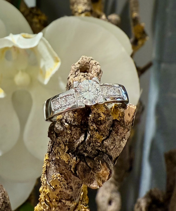 14 Karaat massief witgouden dames solitair ring met zijstenen. Midden steen briljant 0.60 crt G/VSI zijstenen 0.15 crt G/VSI totaal 0.75 crt.