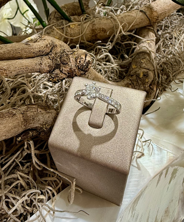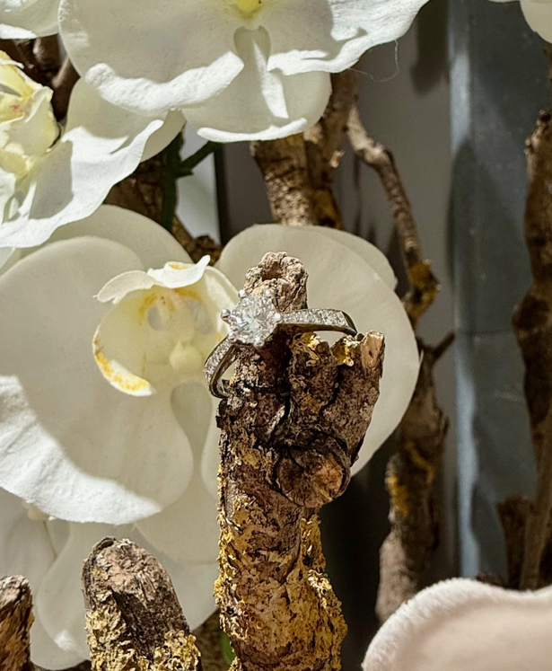14 Karaat wit gouden solitair ring met klassiek witgouden chaton en zij stenen. Totaal 0.69 crt briljant G/VVS1.