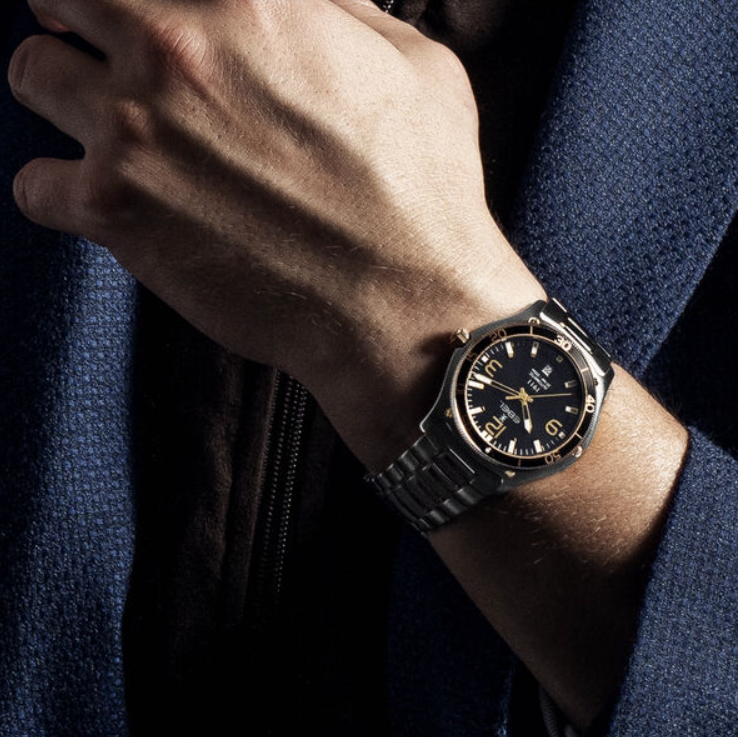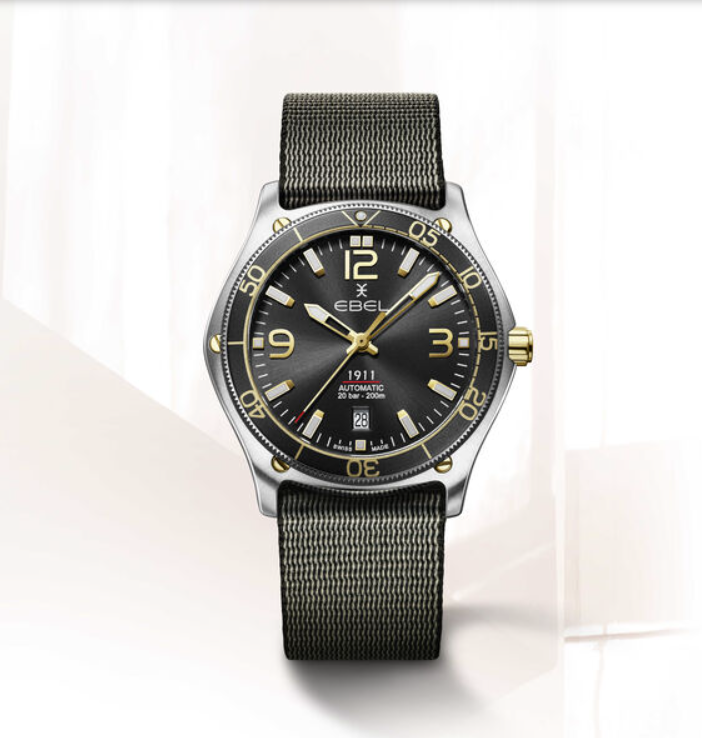 EBEL 1911 - 1216588 heren polshorloge. Edelstalen kast gecombineerd met 18 karaat geel goud met roterende zwarte kast ring Ø 42mm. Zwarte wijzerplaat met met Arabische cijfers en indexen met Super-LumiNova®. Datum venster op 6 uur. Ontspiegeld Saffier glas. Saffier glazen achter deksel. Edelstalen band met klap sluiting. Wordt geleverd met een extra kunststof band van gerecycled Ocean plastic. Zwitsers uurwerk Mechanisch Automaat. 20 ATM waterdicht.