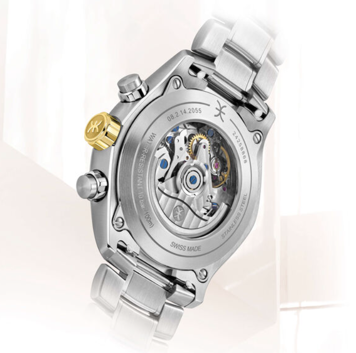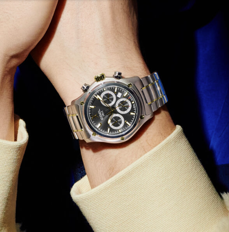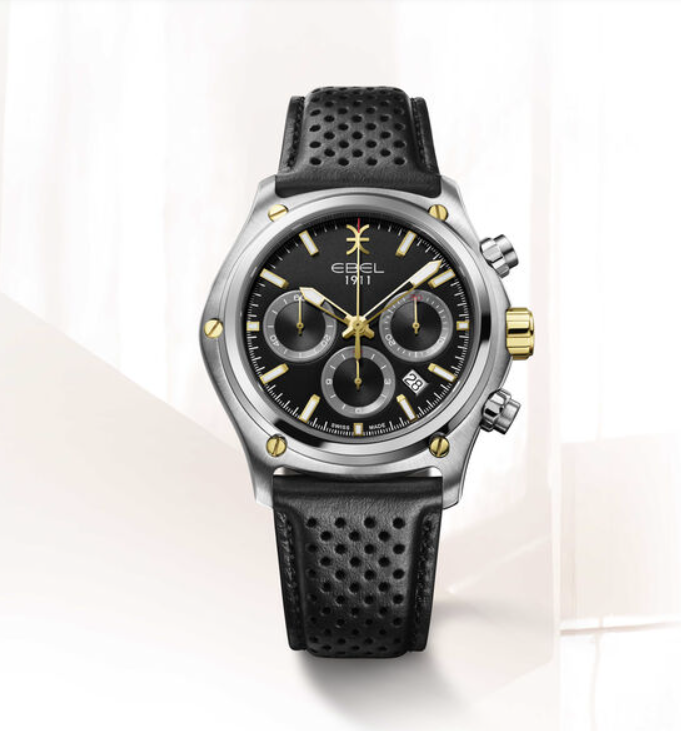 EBEL 1911 - 1216619 heren pols horloge. Edelstalen kast gecombineerd met 18 karaat geel goud. Ø 44 mm. Zwarte wijzerplaat. met chronogaaf en datum aanduiding. Ontspiegeld Saffier glas en Saffier glazen achter deksel. Edelstalen band met goud accenten en klap sluiting. Zwitsers uurwerk mechanisch chronograaf. 10 ATM waterdicht. Wordt geleverd met een extra zwarte kalfslederen band.