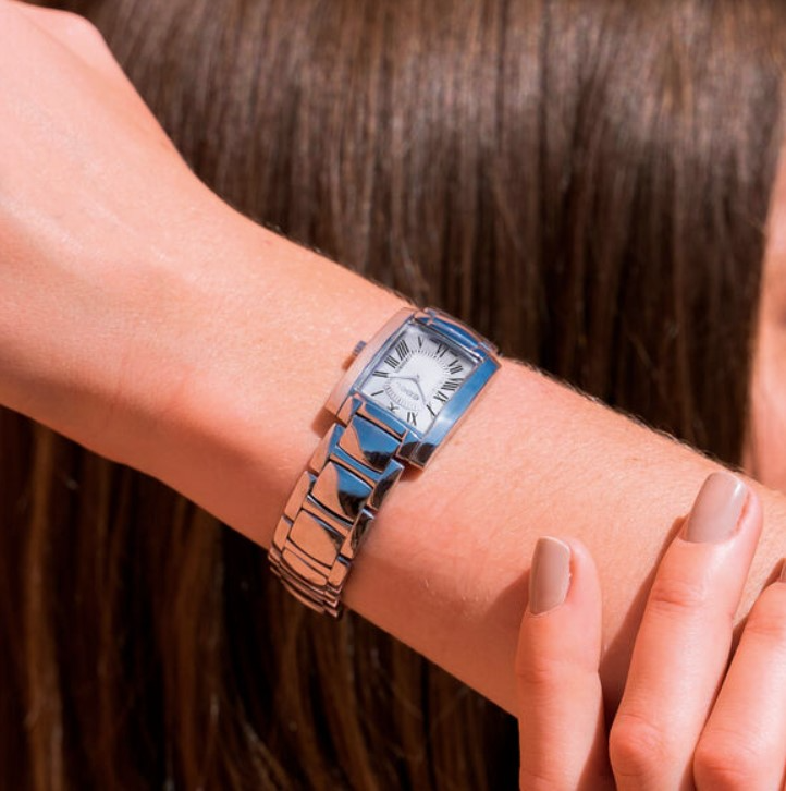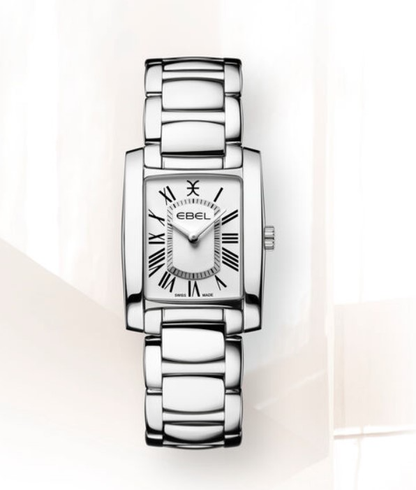 Ebel pols horloge model Brasilia, kast van roestvrij staal, 22,90 mm breed, gepolijste afwerking, witte opaal wijzerplaat met geschilderde Romeinse cijfers en minutenschaal, saffierglas met antireflectie behandeling aan de onderkant, band van roestvrij staal, Zwitsers quartz-uurwerk, waterbestendig tot 50 meter.