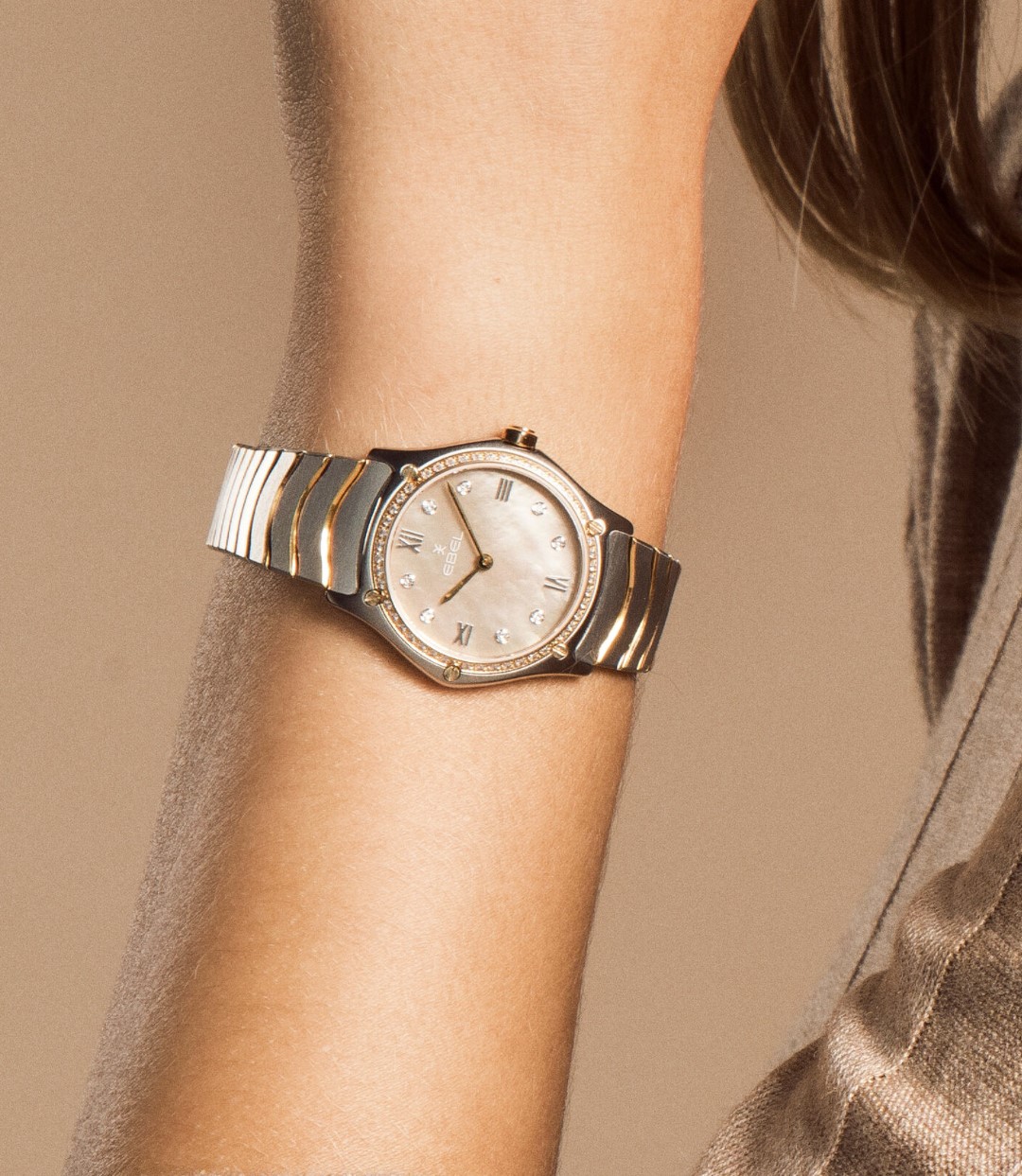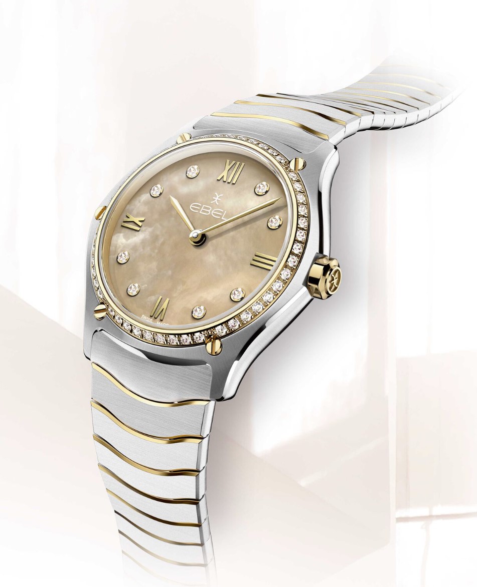 Women's EBEL Sport Classic, Stainless steel and 18K yellow gold case with 47 diamonds (0.3055ct), Ø 29mm, beige mother-of-pearl dial with applied Roman numerals and 8 diamonds (0.052ct), sapphire crystal with antireflective treatment underneath, two-tone stainless steel wave link bracelet with a folding clasp, Swiss quartz movement, water-resistant up to 5 bar