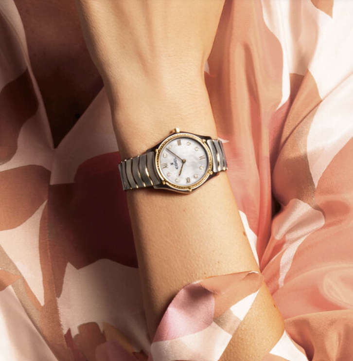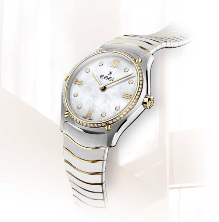EBEL Sport Classic - 1216521A dames pols horloge. Edelstalen kast gecombineerd met 18 karaat geel goud. Ø 33 mm. Witte parelmoeren wijzerplaat met Romeinse cijfers en 8 diamanten en met briljant bezette kastrand totaal 67 stuks ( 0.436 crt ). Ontspiegeld Saffier glas. Edelstalen Wave band met goud accenten en klap sluiting. Zwitsers quartz uurwerk. 5 ATM waterdicht.