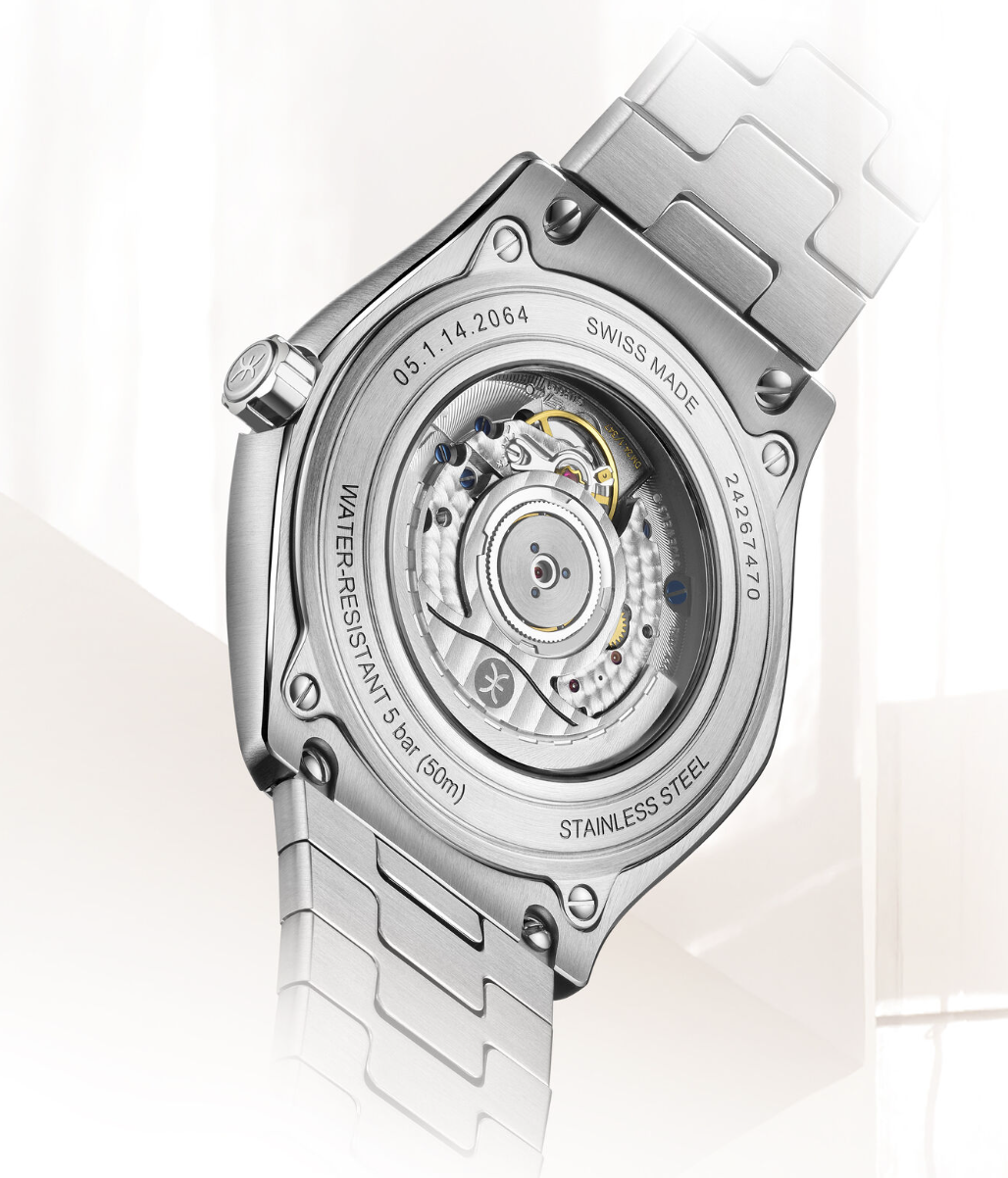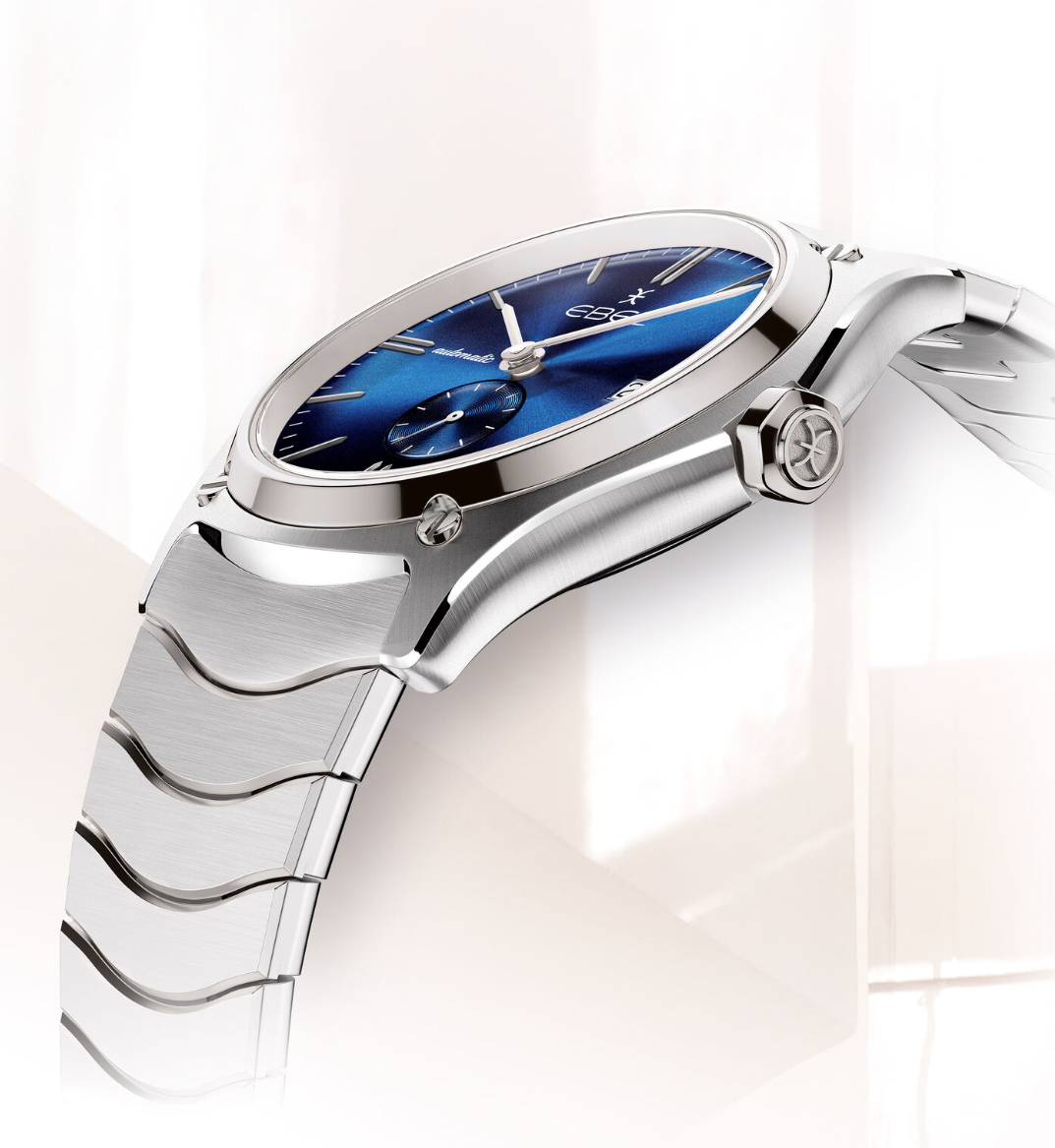 Herenhorloge EBEL Sport Classic, kast van roestvrij staal, Ø 42 mm, blauwe galvanische wijzerplaat met rhodium-geplateerde indexen, kastvormig saffierglas met antireflectie behandeling aan de onderkant, golfschakelband van roestvrij staal met vouwsluiting, automatisch Zwitsers uurwerk, waterbestendig tot 5 bar.
