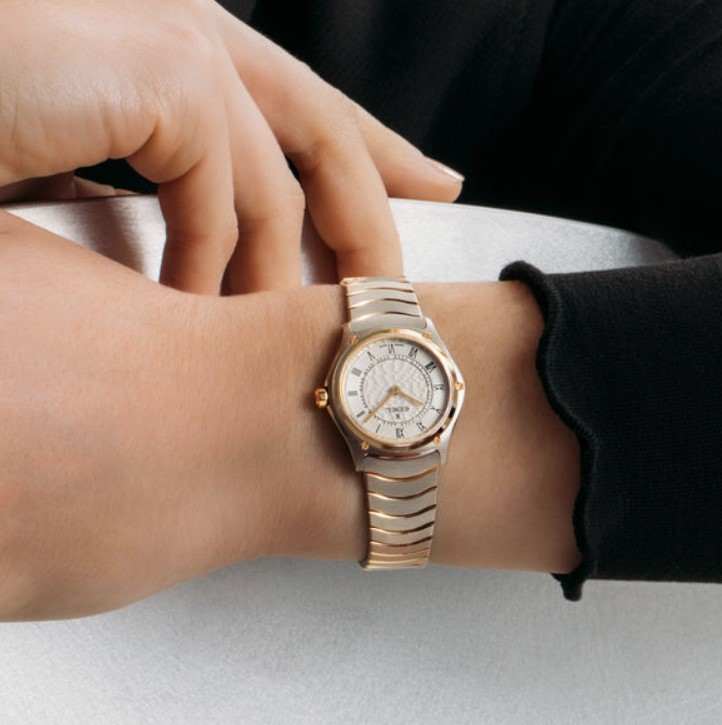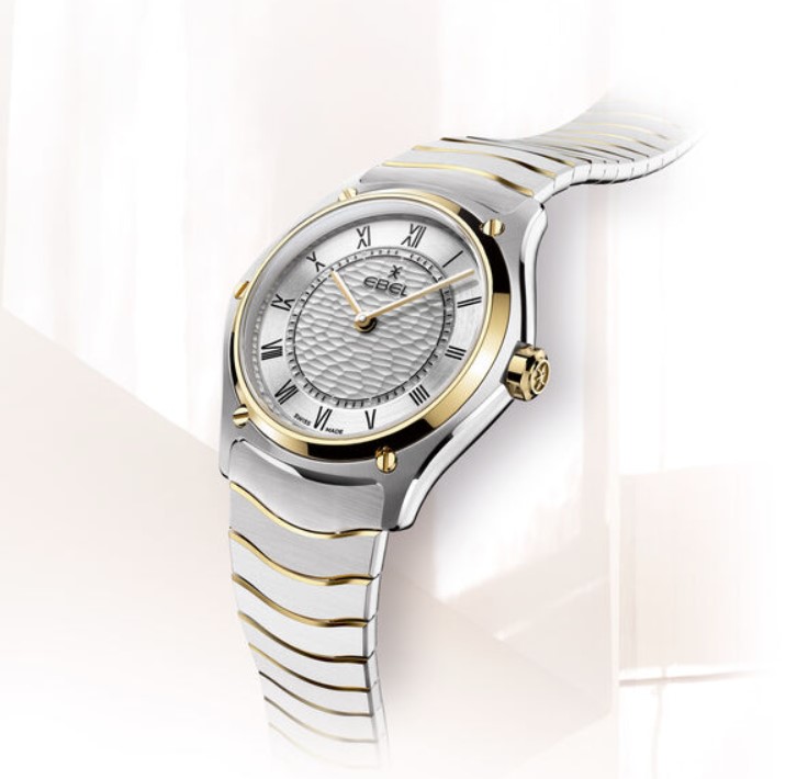 EBEL Sport Classic dameshorloge, kast van roestvrij staal en 18-karaats geelgoud, Ø 29 mm, witte zilveren wijzerplaat met Romeinse cijfers gegraveerd en zwart geverfd, golfpatroon, saffierglas met antireflectie behandeling aan de onderkant, tweekleurige roestvrijstalen golfschakelband met vouwsluiting, Zwitsers quartz-uurwerk, waterbestendig tot 5 bar