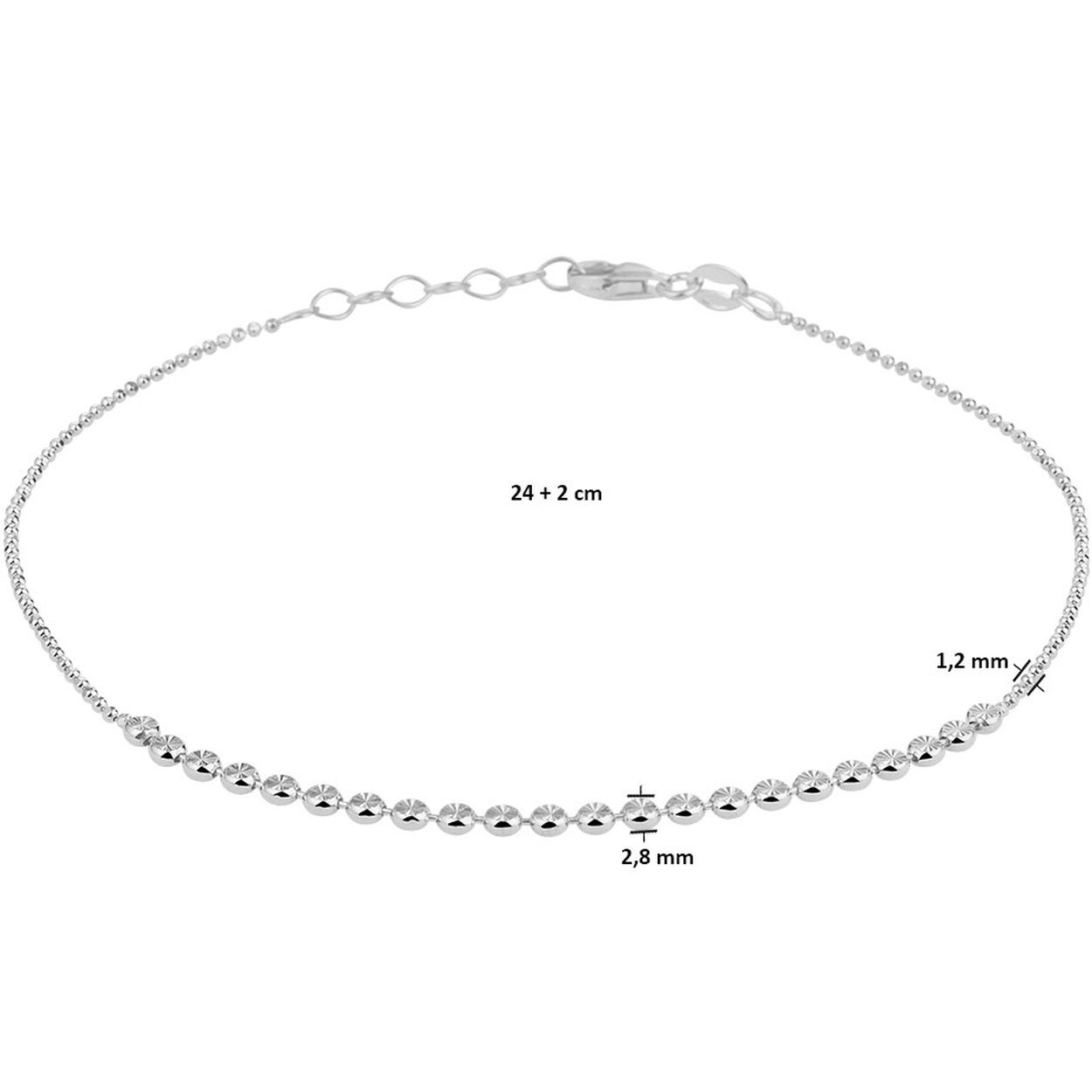 Gerhodineerd 925 zilveren enkelbandje uitgevoerd met rondjes met een gediamanteerde afwerking en een stevige karabijn sluiting. Het enkelbandje heeft een draaglengte van 24cm en een extensie van 2cm.