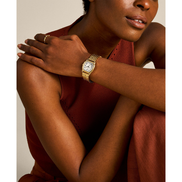 Goudkleurig Fossil horloge. Kastdiameter 27mm. Cremekleurige wijzerplaat met zwarte indexen.
