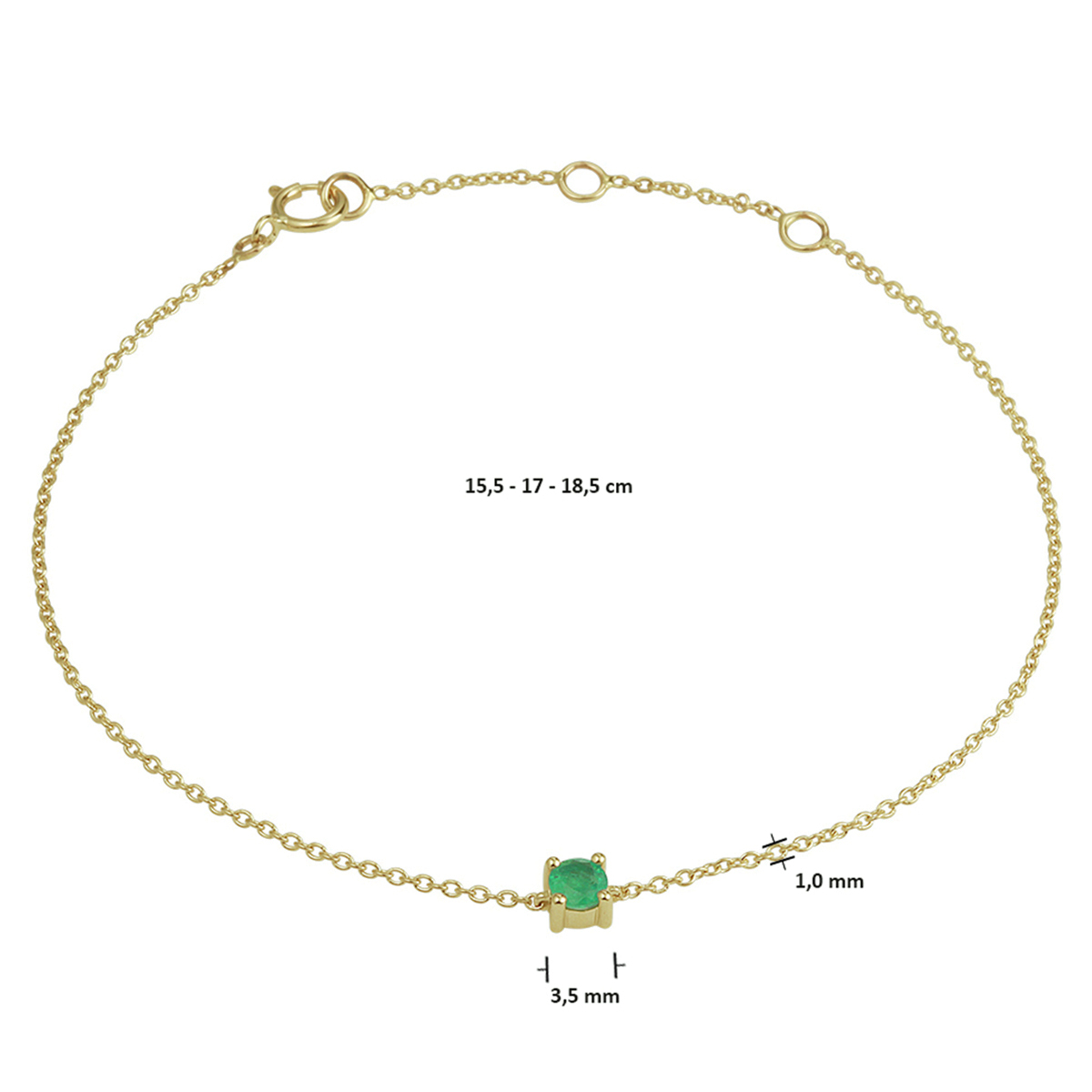 14k Geelgouden anker armband uitgevoerd met een schitterende smaragd. De armband heeft draaglengtes van 15.5, 17 en 18.5cm. De schakelbreedte is 1.0mm.