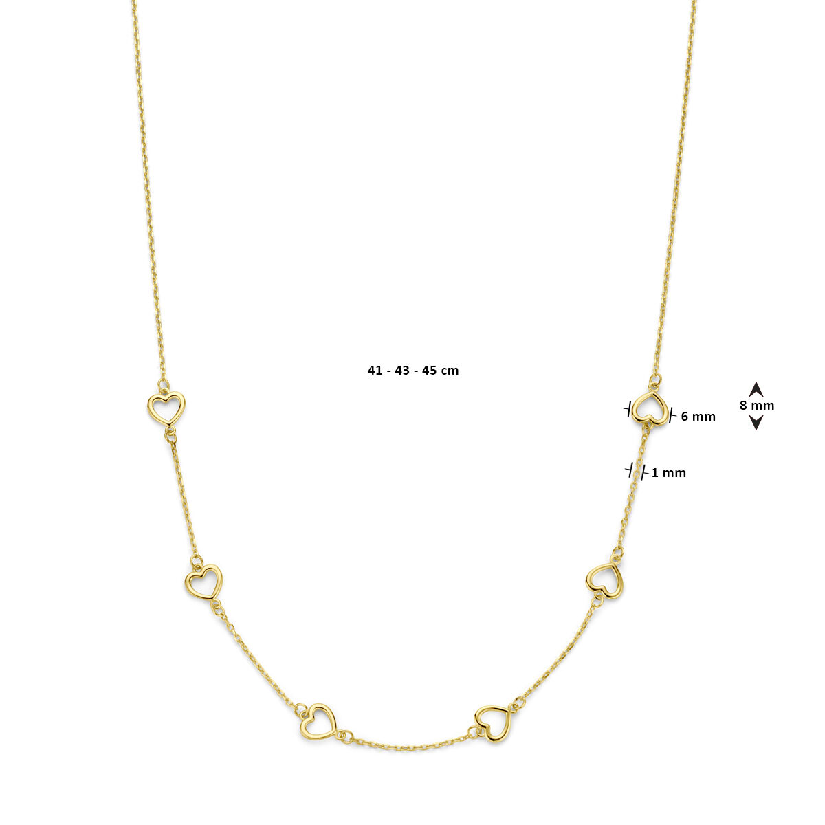 14k Geelgouden collier uitgevoerd met hartjes en een karabijn sluiting. Het collier heeft een draaglengte van 45cm en een schakelbreedte van 1mm.