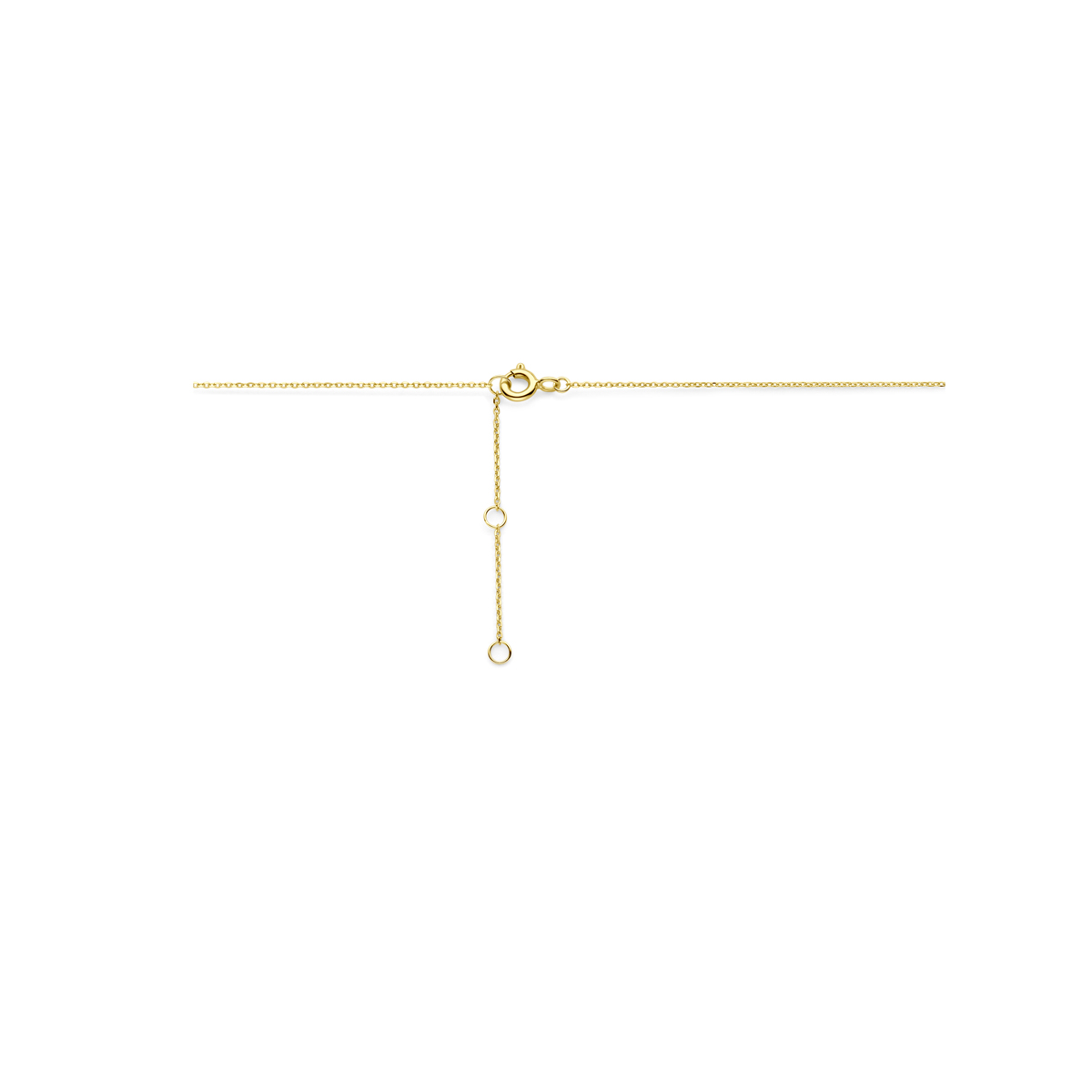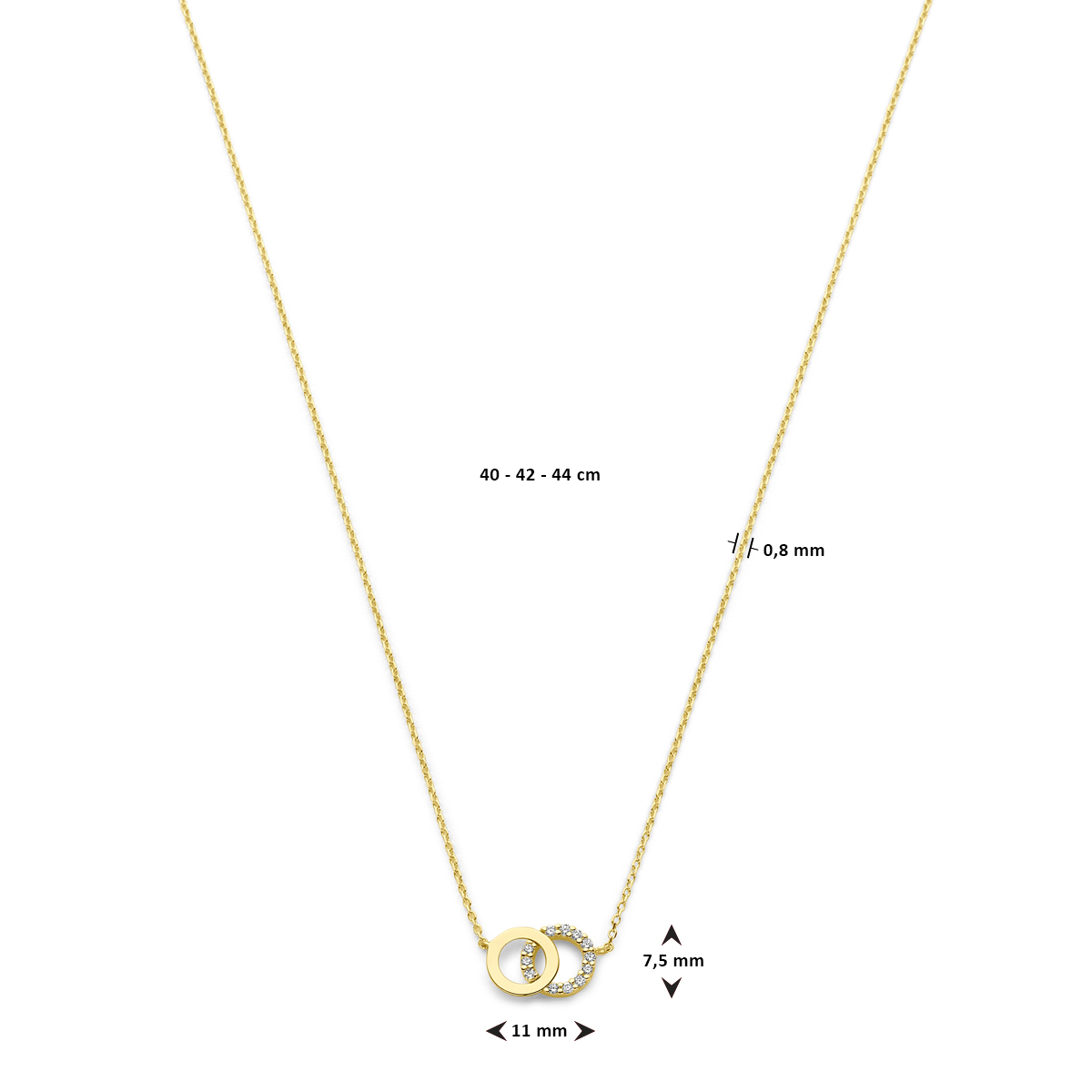 14k Geelgouden collier met twee rondjes met zirkonia. De lengte bedraagt 40cm met 4cm extensie en de schakelbreedte is 0.8mm. De rondjes hebben een totale grootte van 7,5x11mm
