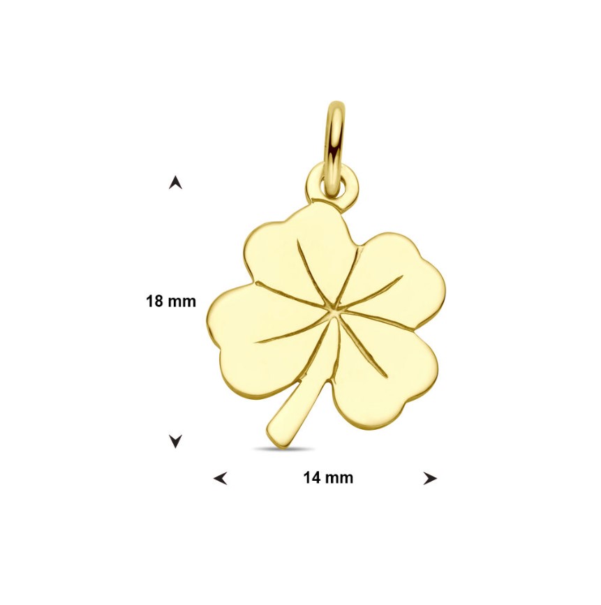 14 Karaat geelgouden hanger klavertje 4, uitgevoerd met een stevig hangoog. 14 x 18 mm.