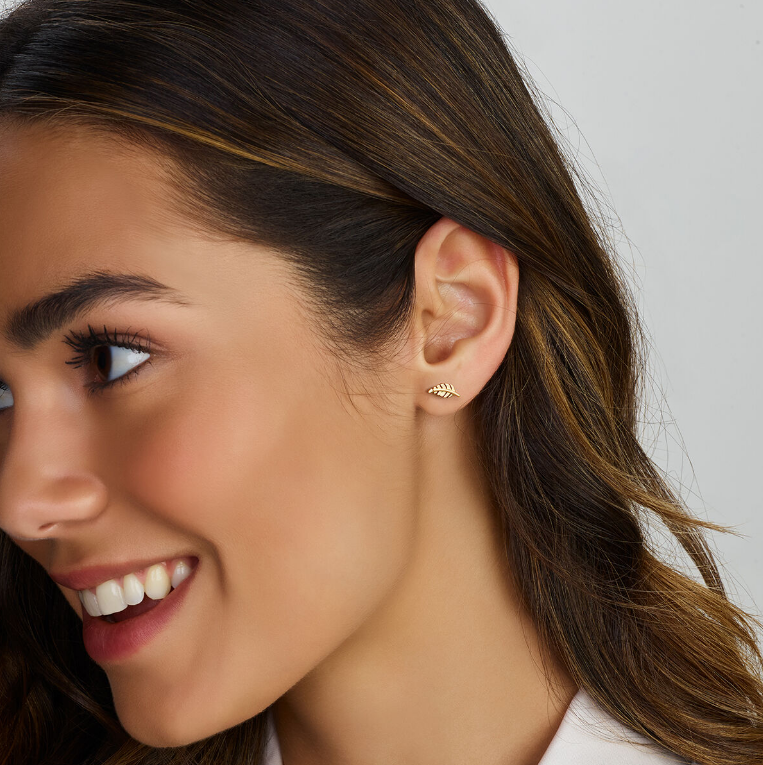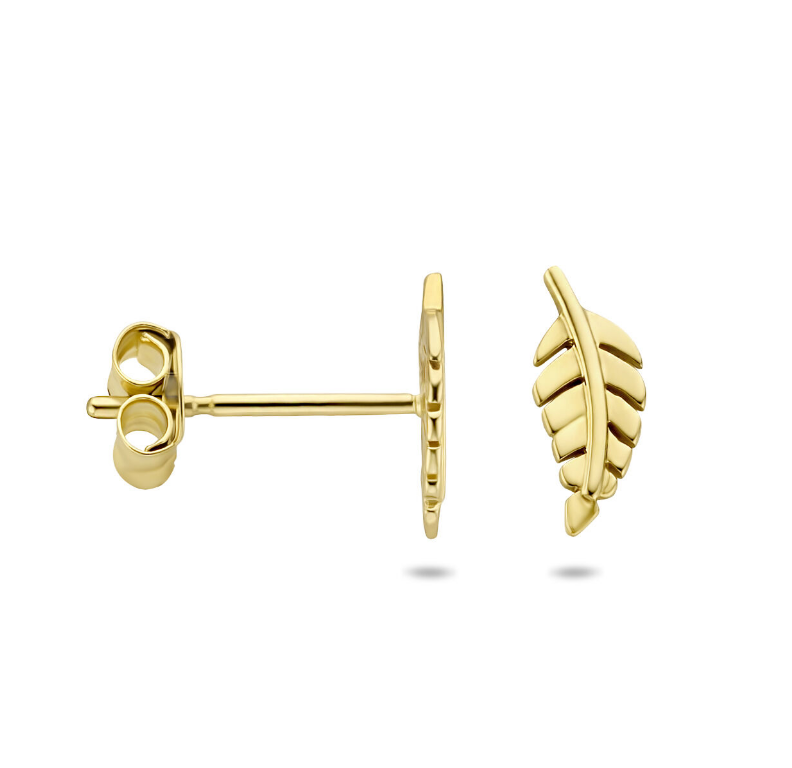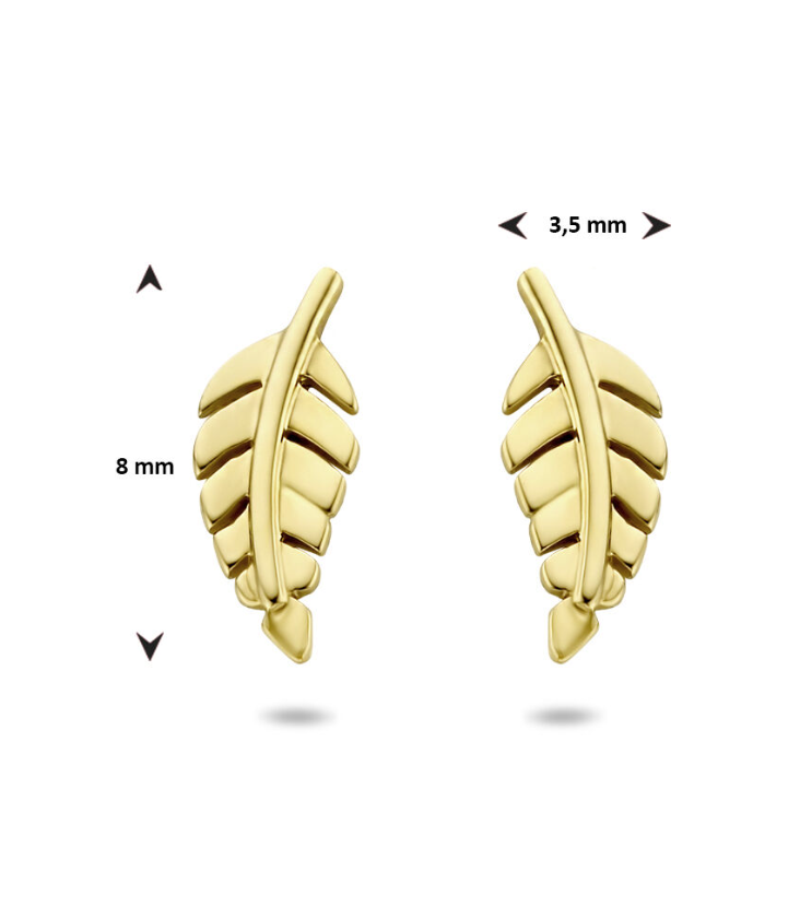 Geelgouden oorstekers in de vorm van een veer met een afmeting van 8x3.5mm. Uitgevoerd met een poussette sluiting.