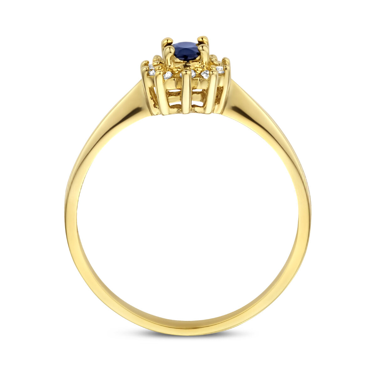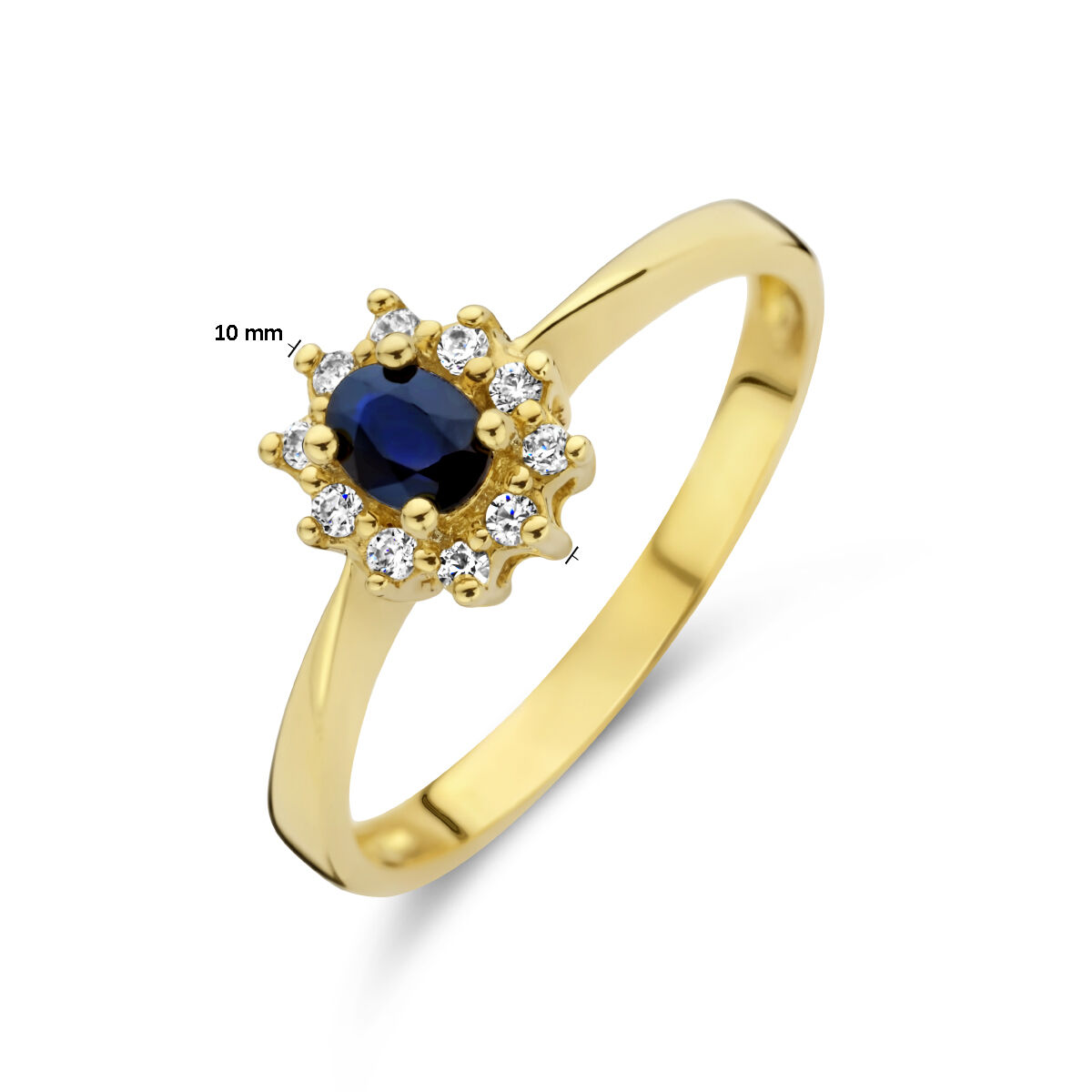 14 Karaat geel gouden entourage ring met blauw saffier en zirkonia's.