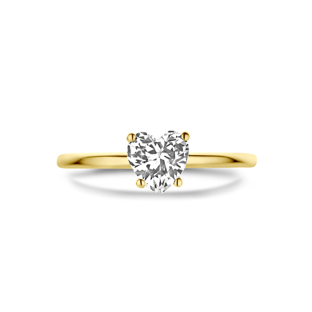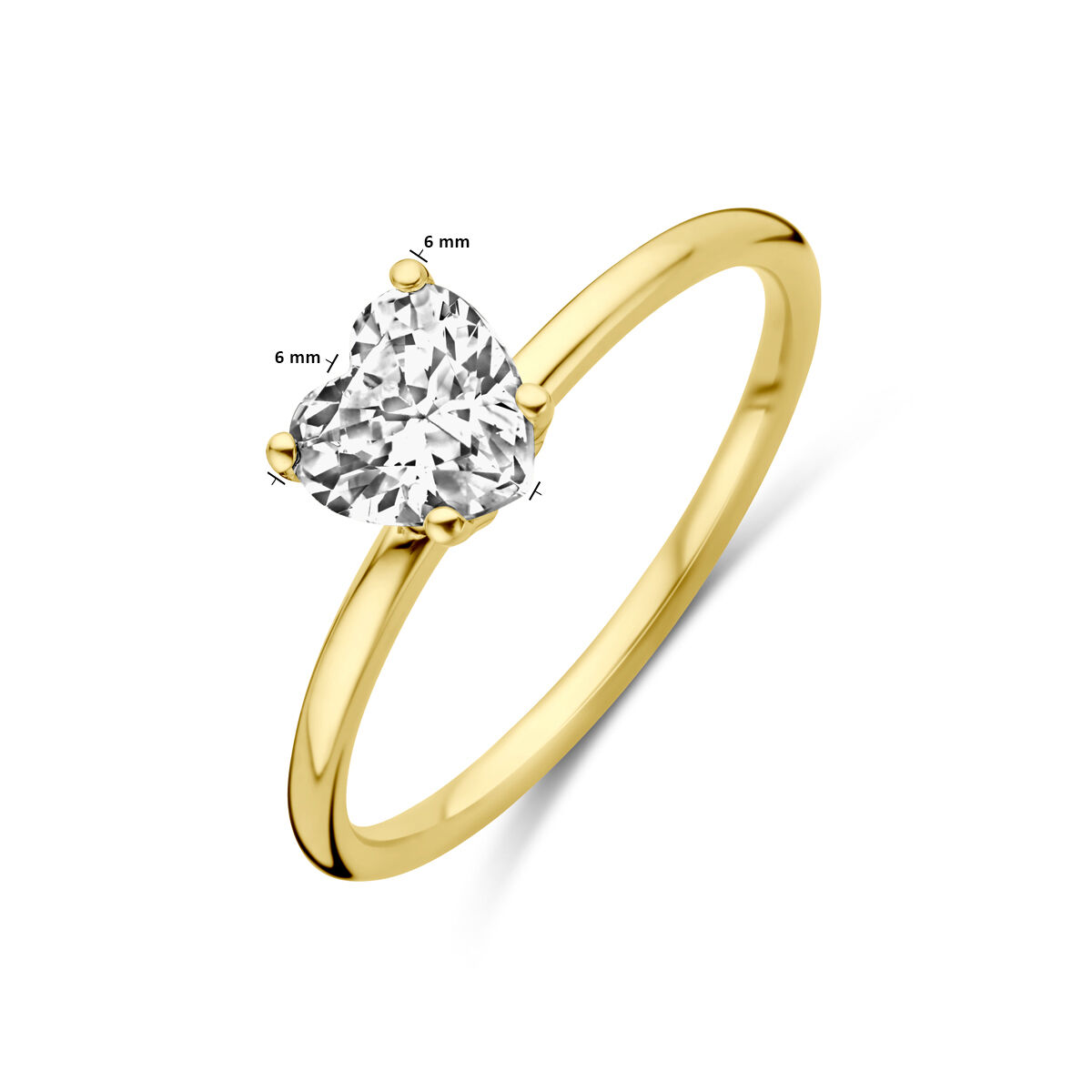 14k Geelgouden ring uitgevoerd met een hart zirkonia. Het hart heeft een afmeting van 6x6mm, maat 17 3/4