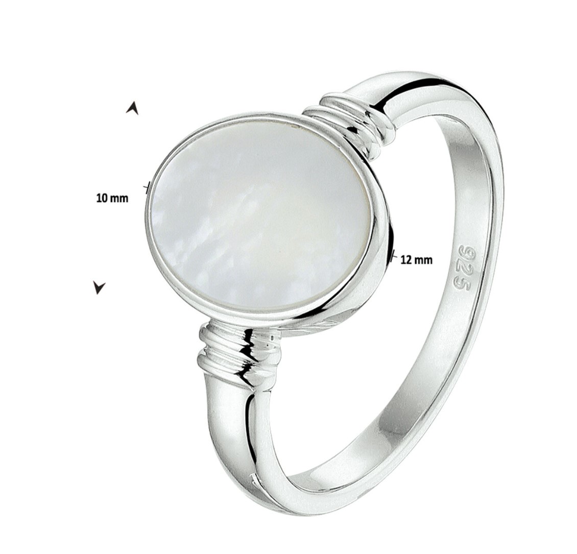 Stijlvolle gerhodineerd zilveren ring met witte parelmoer en een poli afwerking. Info: Gerhodineerd zilver is door de rhodiumlaag beter bestand tegen verkleuren en krassen.