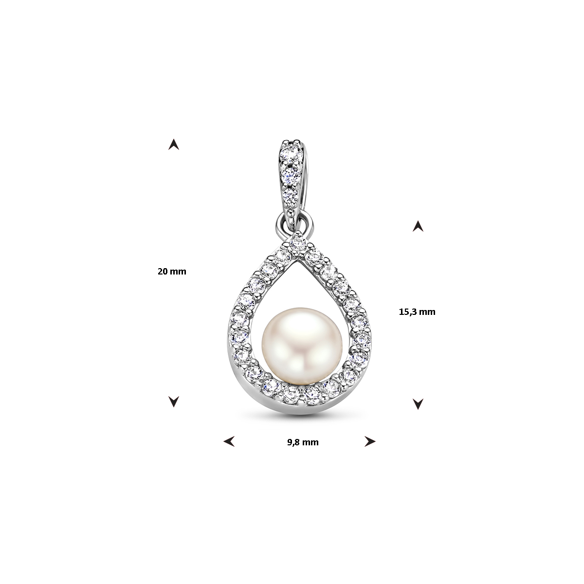Gerhodineerd 925 zilveren hanger uitgevoerd met een parel en zirkonia. De hanger heeft een  totale hoogte van 2cm.