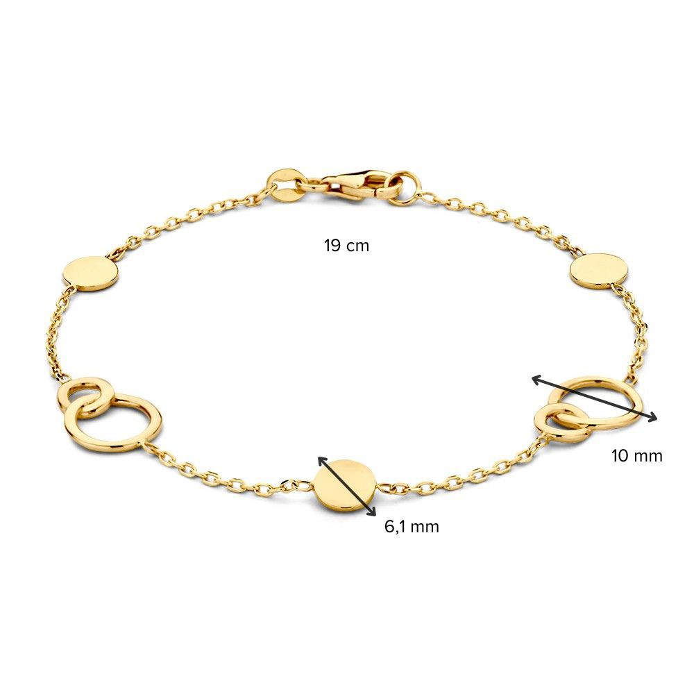 Geelgouden armband met gouden elementen van verbonden cirkels.