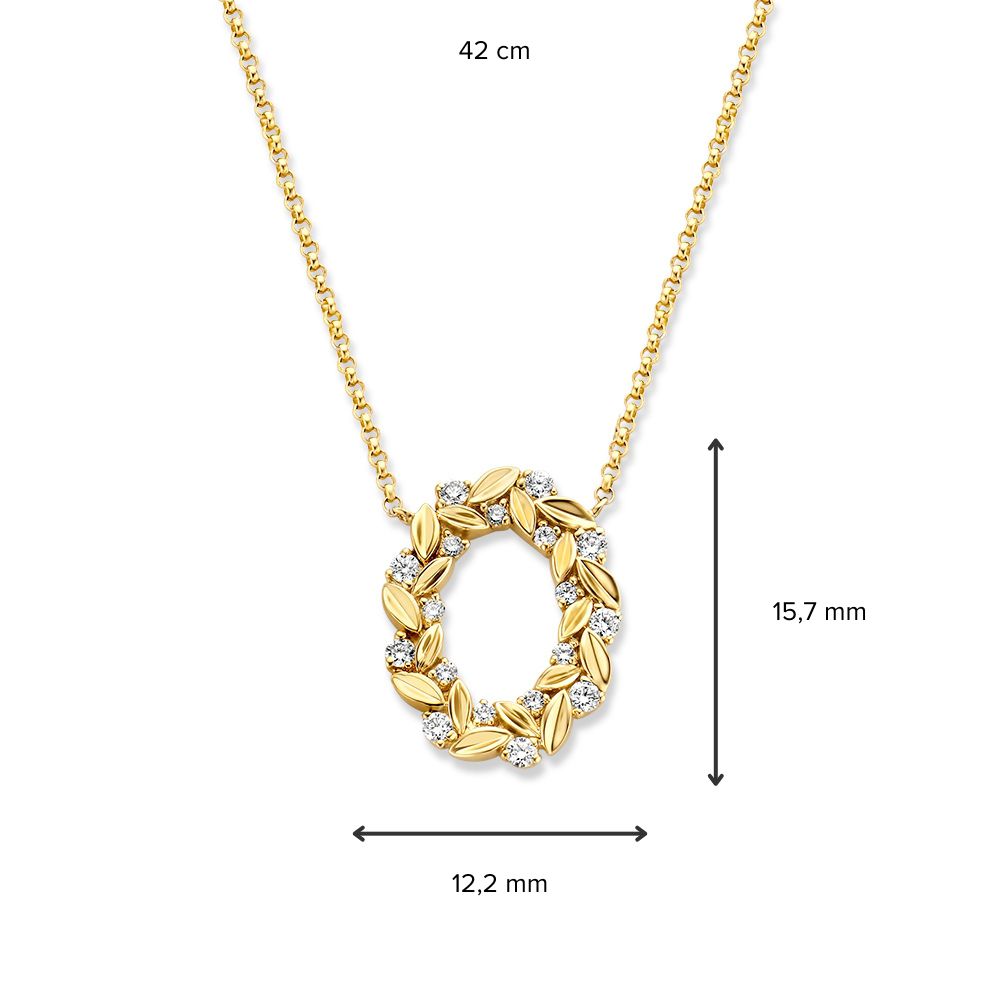 14 Karaat geelgouden collier met vaste hanger van gouden blaadjes 0.20 crt briljant H/SI. Lengte 42 cm.