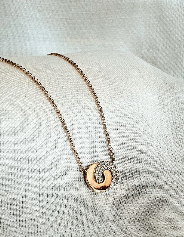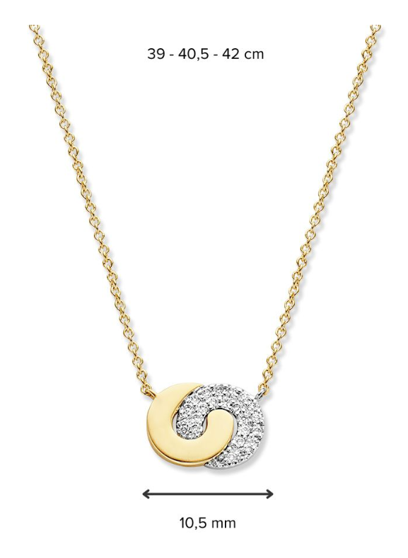 14 Karaat bicolor geel-met witgouden anker collier met 2 verbonden cirkels met 0.08 crt briljant. H/SI. Lengte colier 40-41-42 cm.