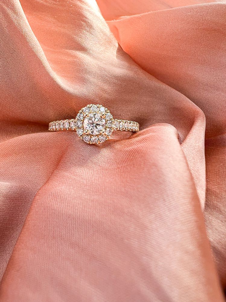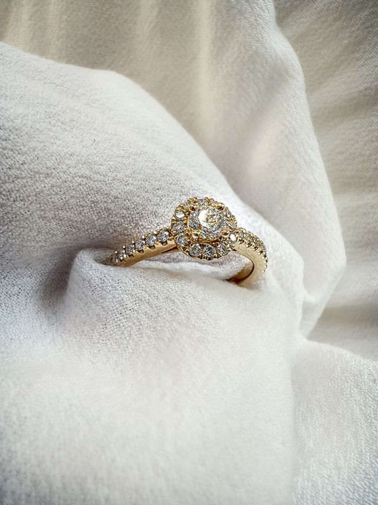 14 Karaat geelgouden ring met 0.62 crt H/SI-1 briljant. Schitterende geelgouden entourage ring met zijstenen in de volle scheen en een middensteen van 0,32 crt. en  De ring is zo ontworpen dat hij naadloos gecombineerd kan worden met een gouden (rij)ring.