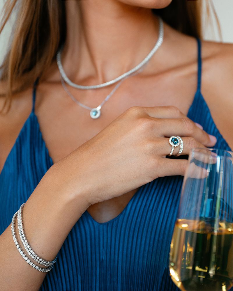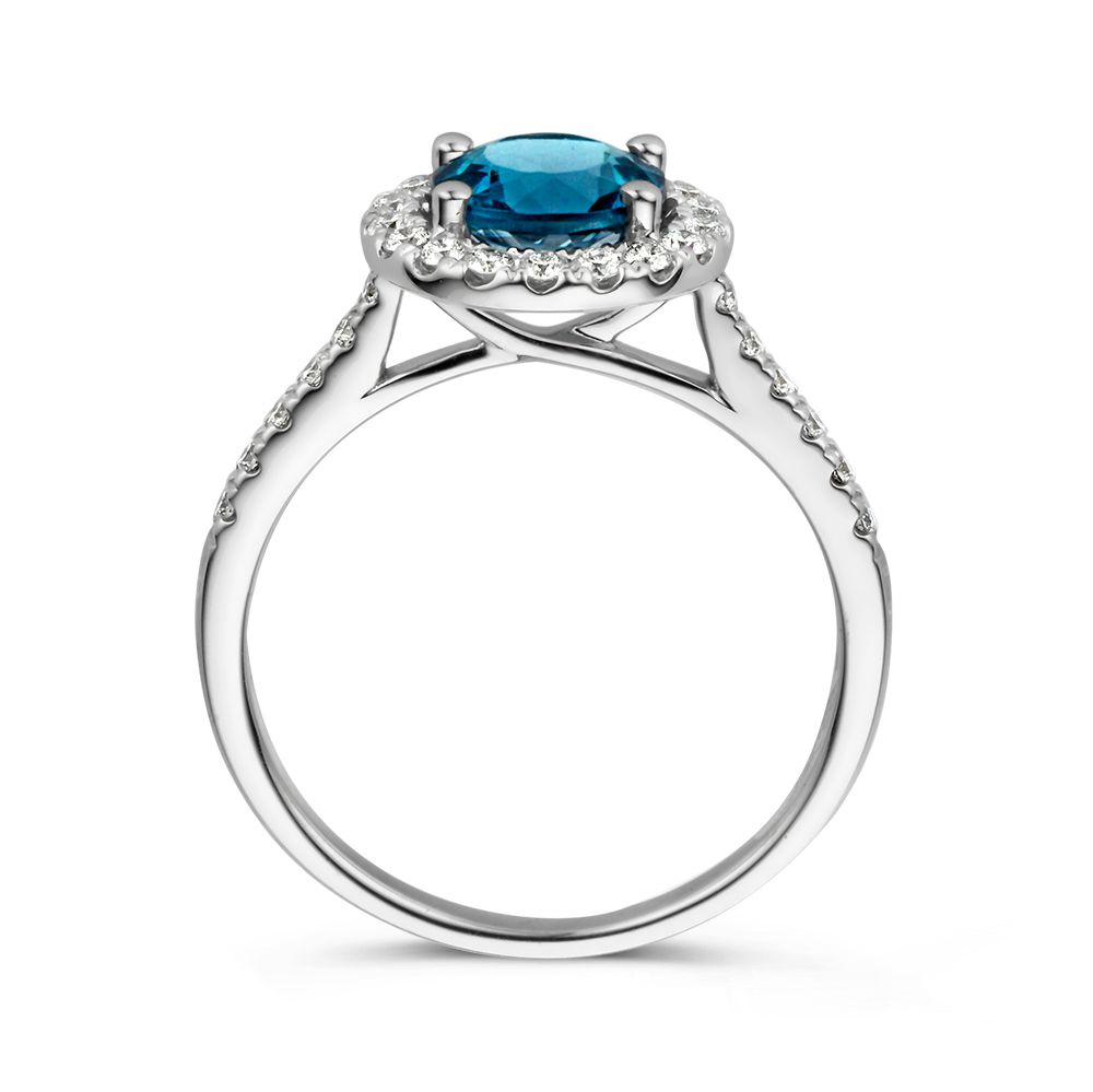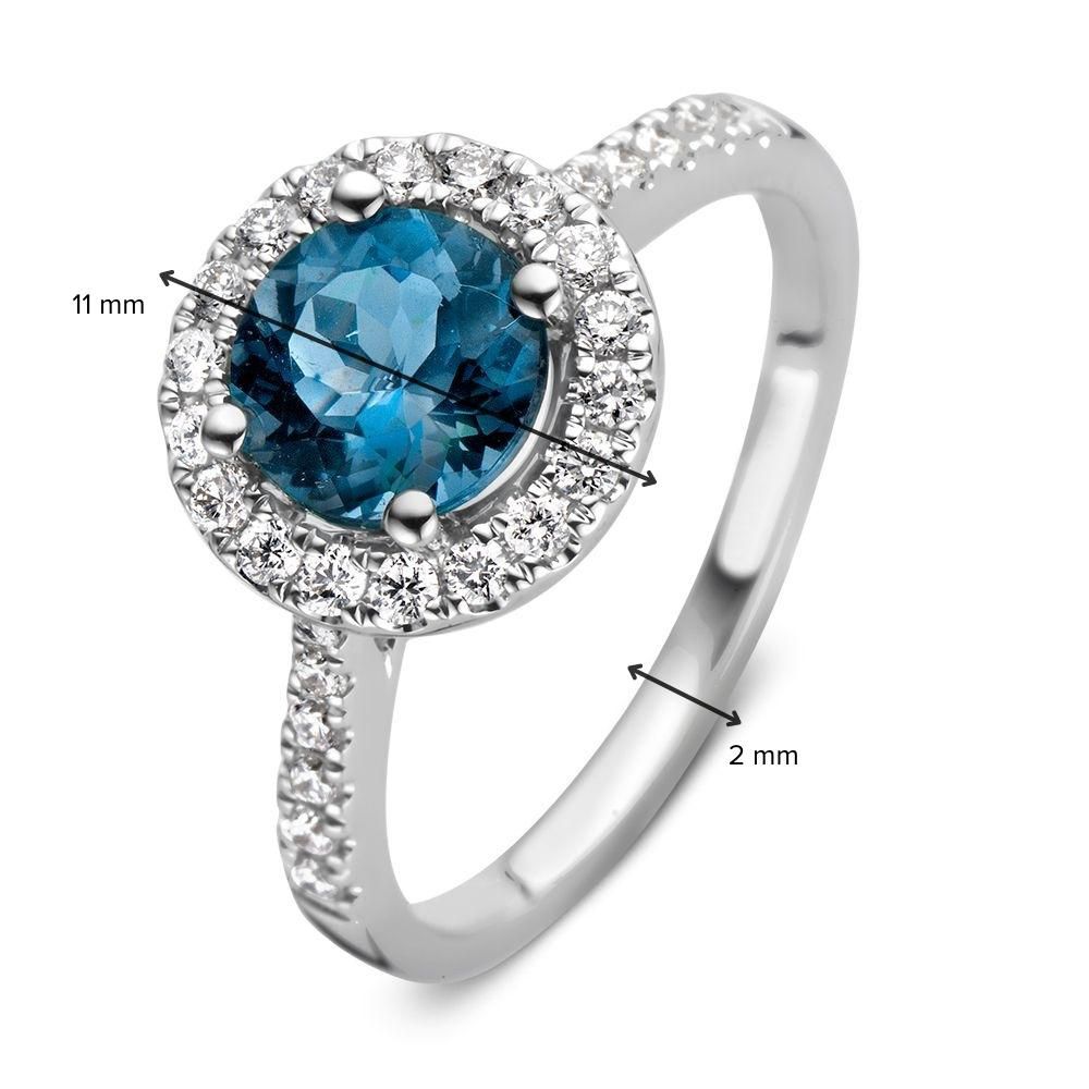 14 Karaat witgouden ring met een opvallende london blue topaas in een entourage zetting met briljant 0,40 crt H-SI-1.