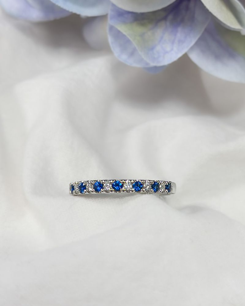 14 Karaat witgouden rij ring met briljant en blauw saffier. Prachtig om los te dragen, maar kan ook perfect gecombineerd worden met bijvoorbeeld een solitair ring. 0.14 crt H/SI briljant en 0.38 crt blauw saffier.
